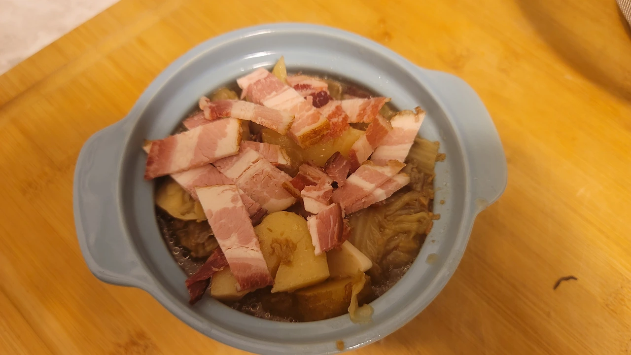 음, 그런데 너무 느끼할 것 같아. 신김치 좀 넣자. 그리고 냉장고에서 아직은 아니지만 곧 문제가 될 것같은 베이컨도 가져와 잘라넣는다. 참고로 된장찌개는 멸치육수로 끓여서 베이컨이 더해지면 묵직함도 배가될 것이다. 역시나 그라탕이란 건 묵직하고 느끼한 맛에 먹는 거지. (그럼 신김치 무엇?)