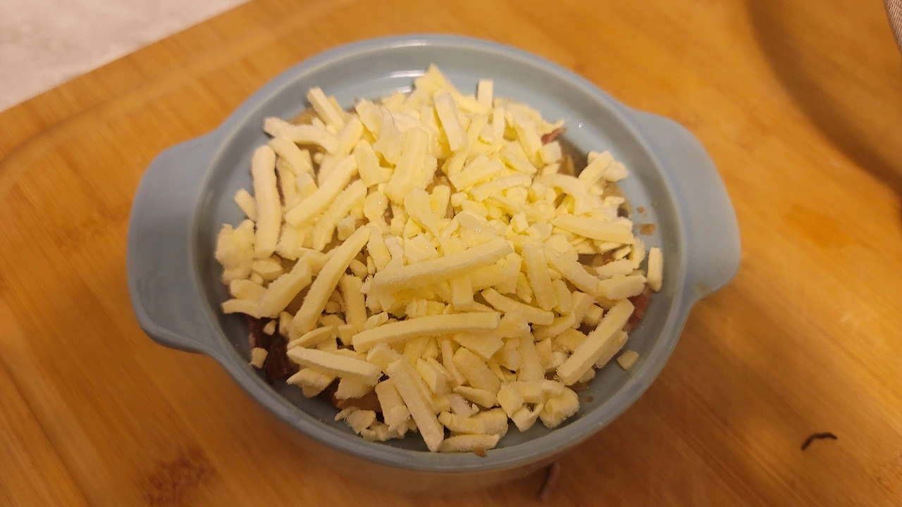 이미 다 익은 거고, 베이컨이나 치즈가 익히기 어려운 식재료가 아니라 180도에 대략 10분만 익혀도 충분하다. 처음엔 뚜껑을 닫고 익혀야 이 정도 시간에 충분히 익는다. 그런데 뚜껑을 닫으면 위의 치즈가 텍스쳐가 안 나오고 푹 퍼지는 단점이 있으니 몇 분만 있다가 뚜껑은 열어준다.