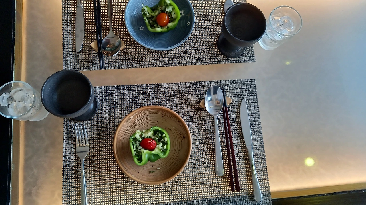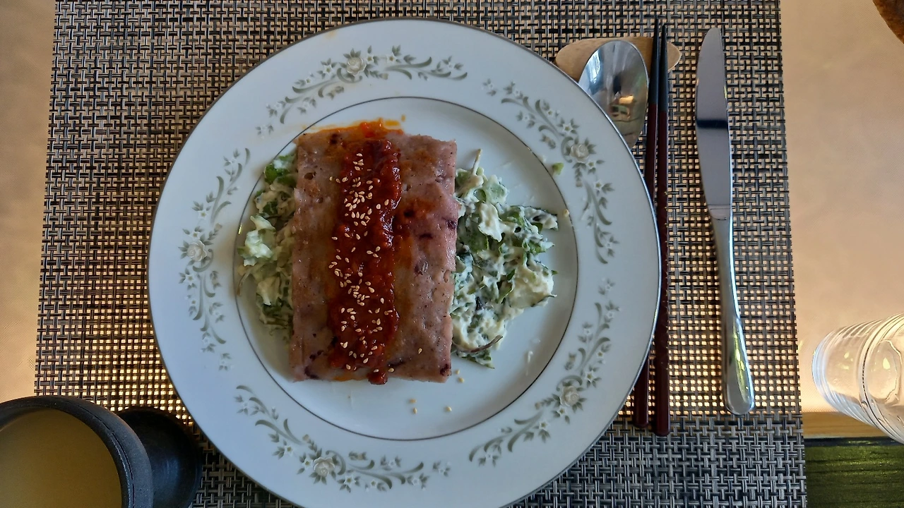 우선 청귤드레싱에 감식초가 들어간다. 오늘은 평소에 쓰는 붉은 바나나 파프리카가 없어서 녹색 파프리카를 썼다. 청귤드레싱은 짜릿함이 시간차를 두고 밀려오는 것이 자랑하는 고안. 거기에 필수적인 것이 강력하지만 찌르지 않는 신맛의 식초다.