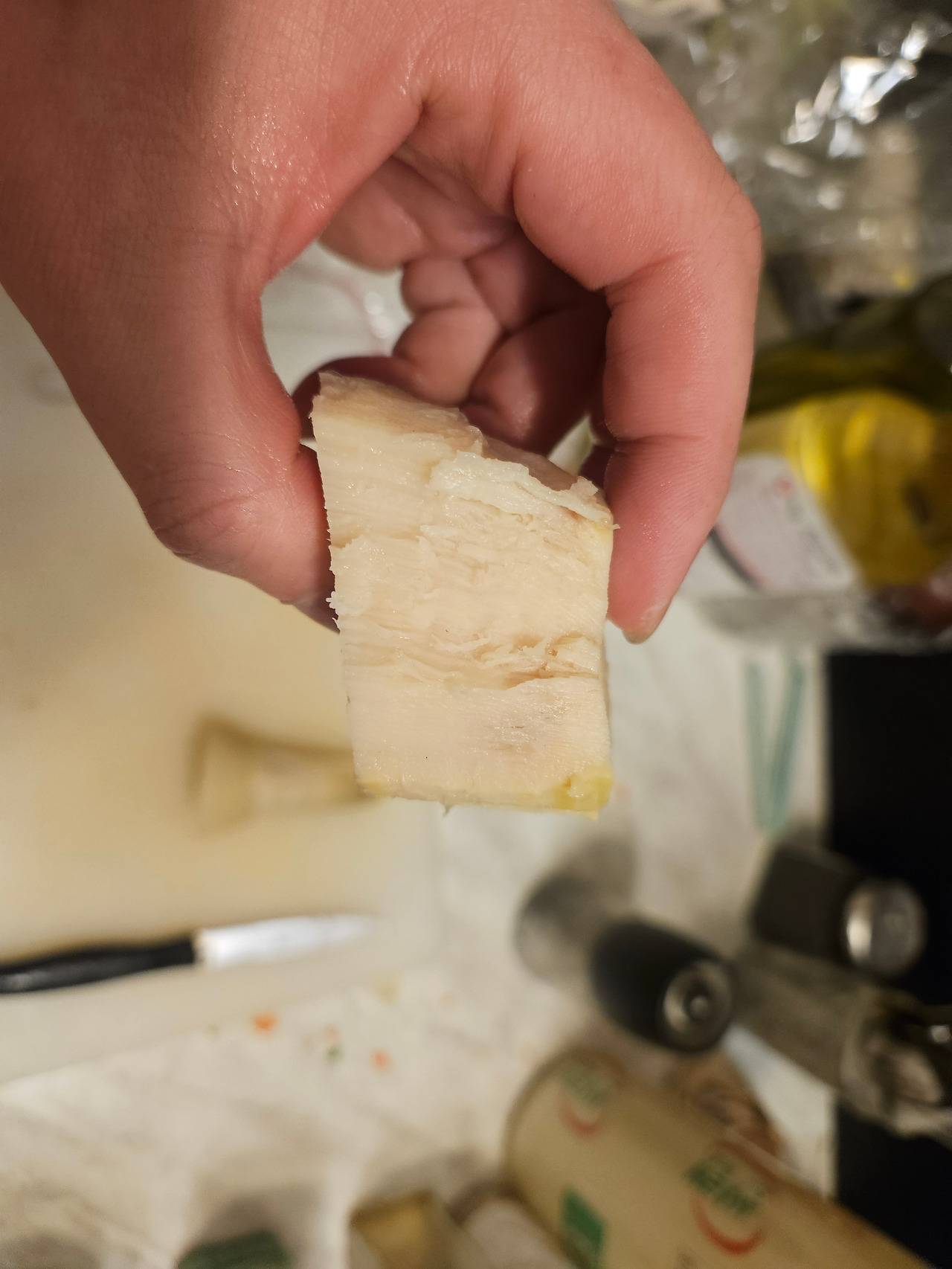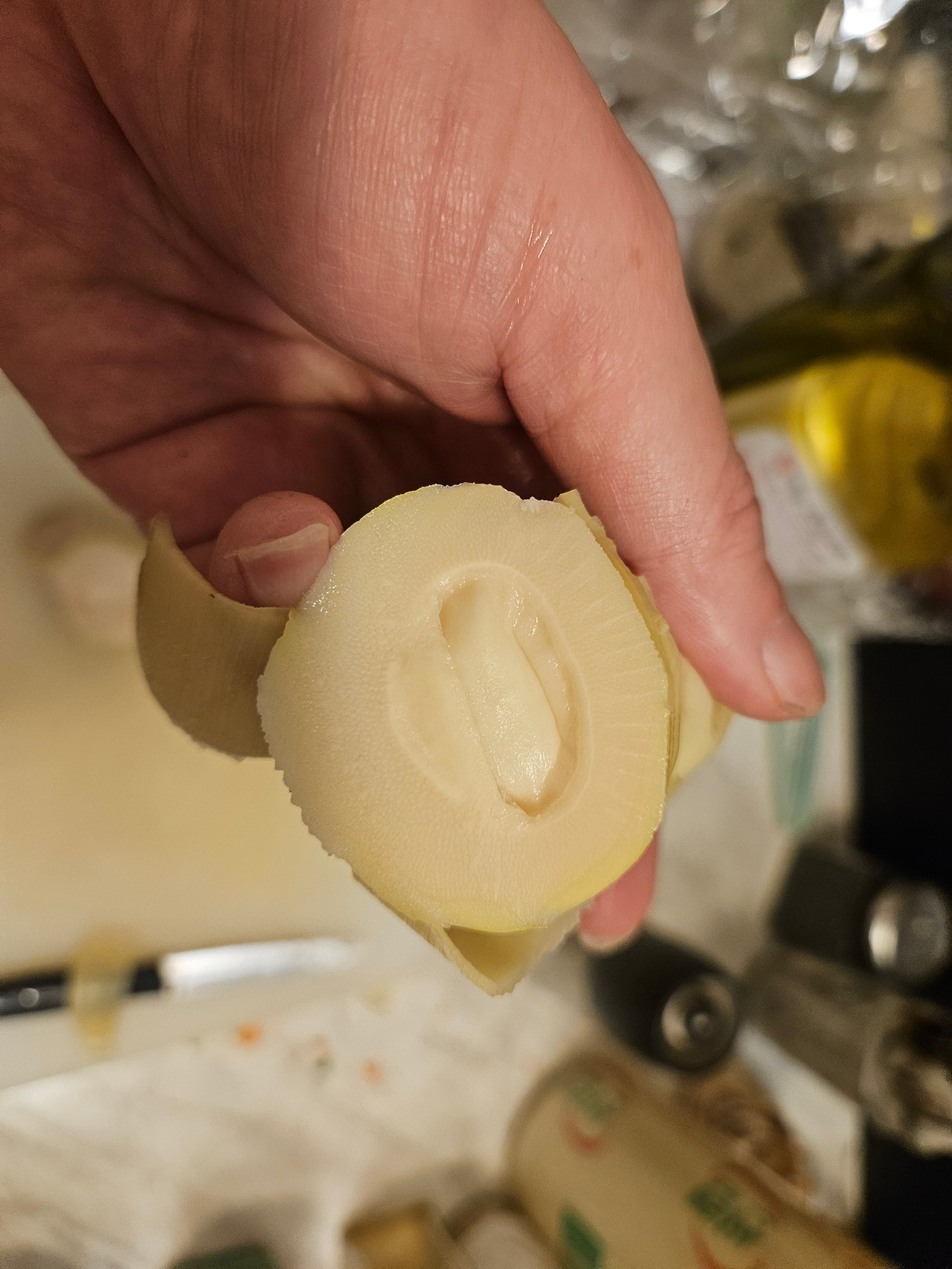 아린맛의 비밀은 오로지 한 가지, 안 삶아서 그렇다. 대표님은 제품은(첫 사진) 항상 삶아서 진공포장이니 당연히 삶은 것이라 생각하셨고 나도 제품을 쓸 때는 당연히 삶은 것을 받으니 이걸 삶을 생각을 못했네. 그래서 볶음으로 가열처리한 것은 한결 가벼웠던 것이고.