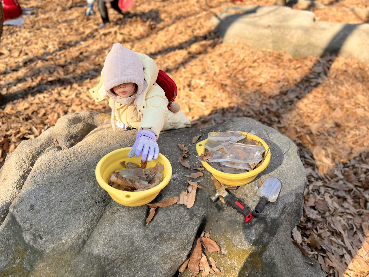 도토리숲에 도착해 보니, 누가 놀다 갔는지, 커다란 얼음판 몇 개가 바위 위에 놓여있더군요. 얼음을 보자마자 달려든 아이들은 얼음 깨부수기로 숲놀이를 시작했습니다.
