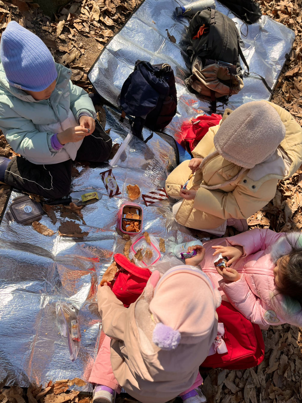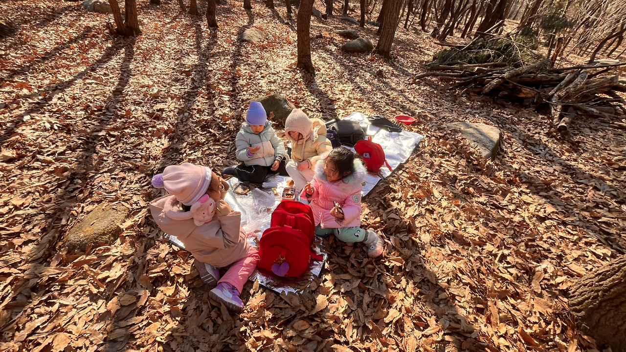 얼음을 깨고 주변의 도토리나무들을 살피는 아이들 옆에 돗자리를 깔아놓고