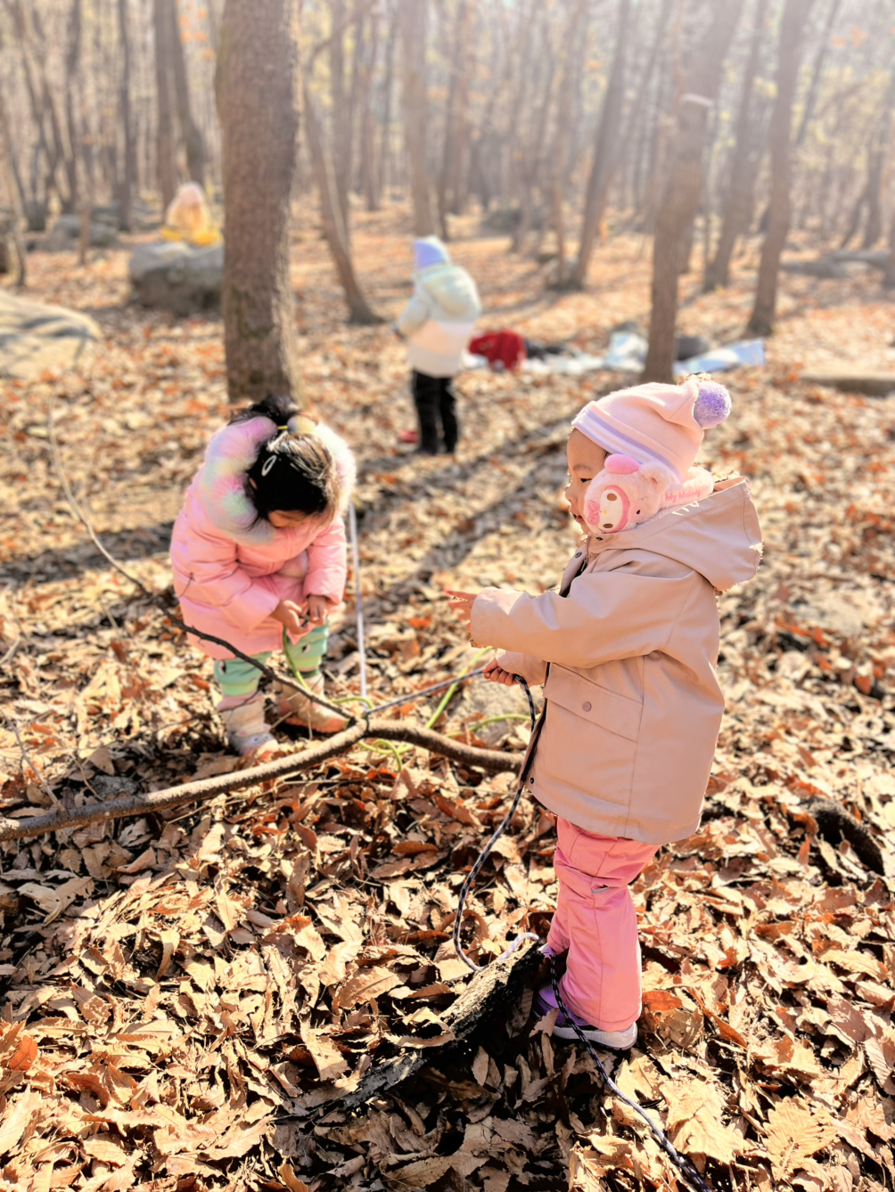 숲에서 걷는 법, 팀워크를 유지하며 걷는 법, 나무 사이에서 얼굴을 보호하는 법, 낙엽 밭 속을 안전하게 걷는 법 등, 알려주고 몸에 익혀줘야 할 것들이 참 많답니다. 아이들이 자유롭고 안전하게 숲길을 걸을 수 있도록 도와주는 기술들이죠.