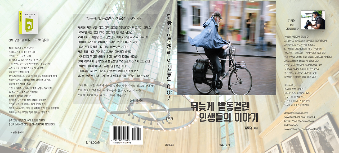 결국 나는 <뒤늦게 발동걸린 인생들의 이야기>라는 책을 직접 만들어 보기로 결심했다. 책의 모든 과정을 혼자서 한 번 해보기로 마음먹은 것이다. 결국 그렇게 해서 원고는 물론이고 본문 편집과 표지 디자인 제작까지 모든 것을 혼자서 만들었다. 책의 본문을 편집할 때는 보통 문서를 쓸 때 사용하는 '한글' 프로그램으로 본문을 디자인했다. 쿽이니 인디자인(Indesign)이니 하는 출판 전용 프로그램들은 엄두도 낼 수 없었다.
