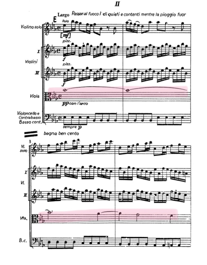 비올라 역시 이 곡에서 중책을 담당하고 있는데요 가장 유명한 것은 바로 ‘개 짖는 소리’입니다. 비올리스트는 이 곡을 위해 어떻게 하면 더 개가 짖는 소리를 더 잘 표현할 수 있을지 연구해야 합니다. ‘봄’의 2악장에서 비올라 파트에 Il cane che grida = 개가 짖는 소리라고 쓰여있거든요.