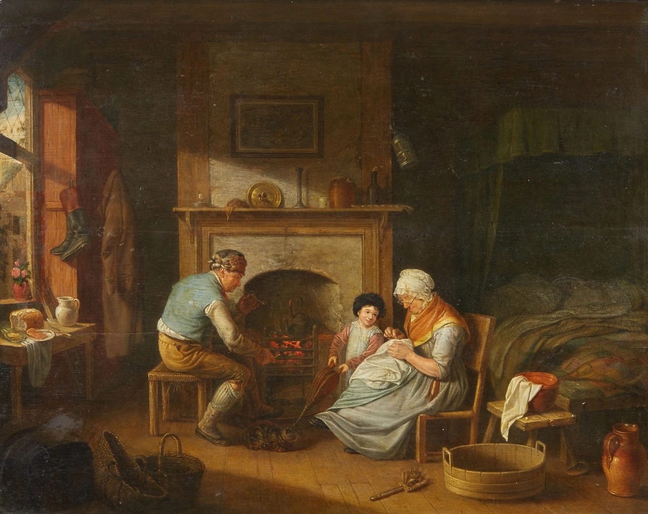 겨울비가 내리는 날 난롯가에 앉아 조용히 불을 쬐며 아늑한 시간을 보내는 모습