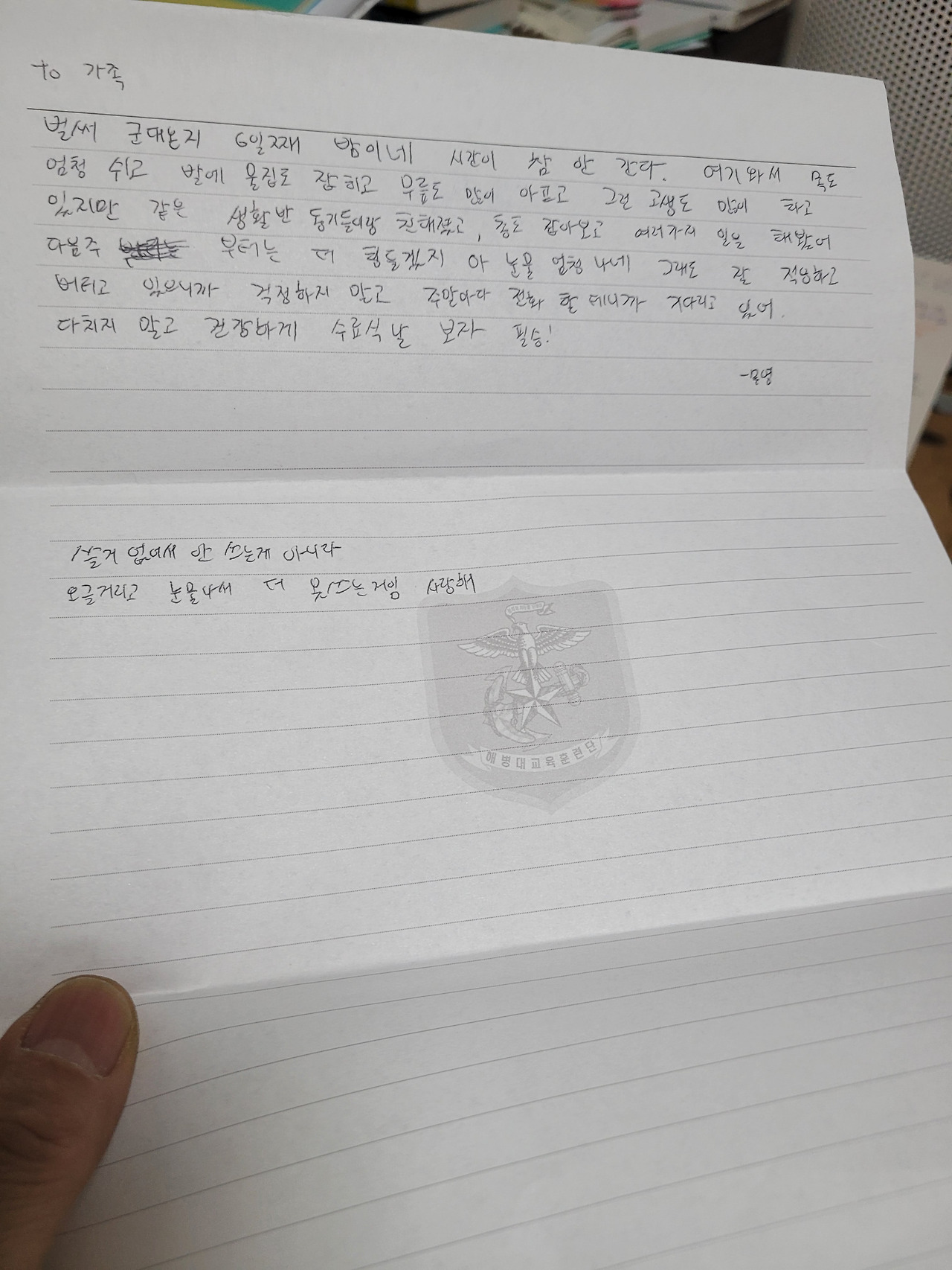 짧은 글 속에서 느껴지는 서툰 표현, 삐뚤빼뚤한 글씨체… 그러나 그 안에는 분명히 성장의 흔적이 있었다. 힘들고 지치고 피곤했을 텐데도, 가족을 떠올리며 몇 줄이라도 채워낸 아들의 마음이 뭉클하게 다가왔다.