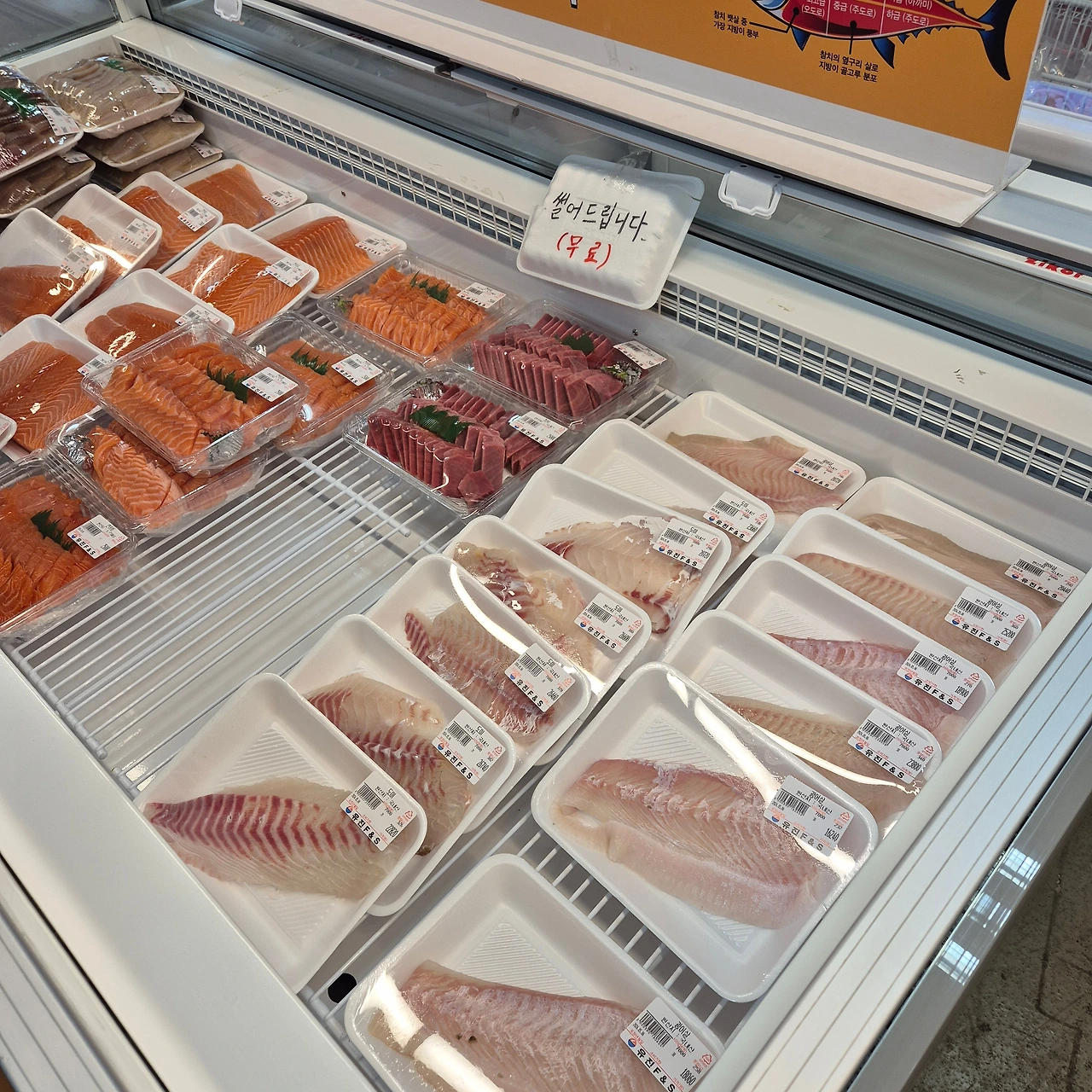 이건 필렛회만 있는 진열대입니다. 개인적으로 인상적이라 찍어 봤습니다. 보편적인 생선 종류들이지만 흥정 없이 합리적으로 횟감을 살 수 있다는 장점이 있다고 느껴졌습니다.
