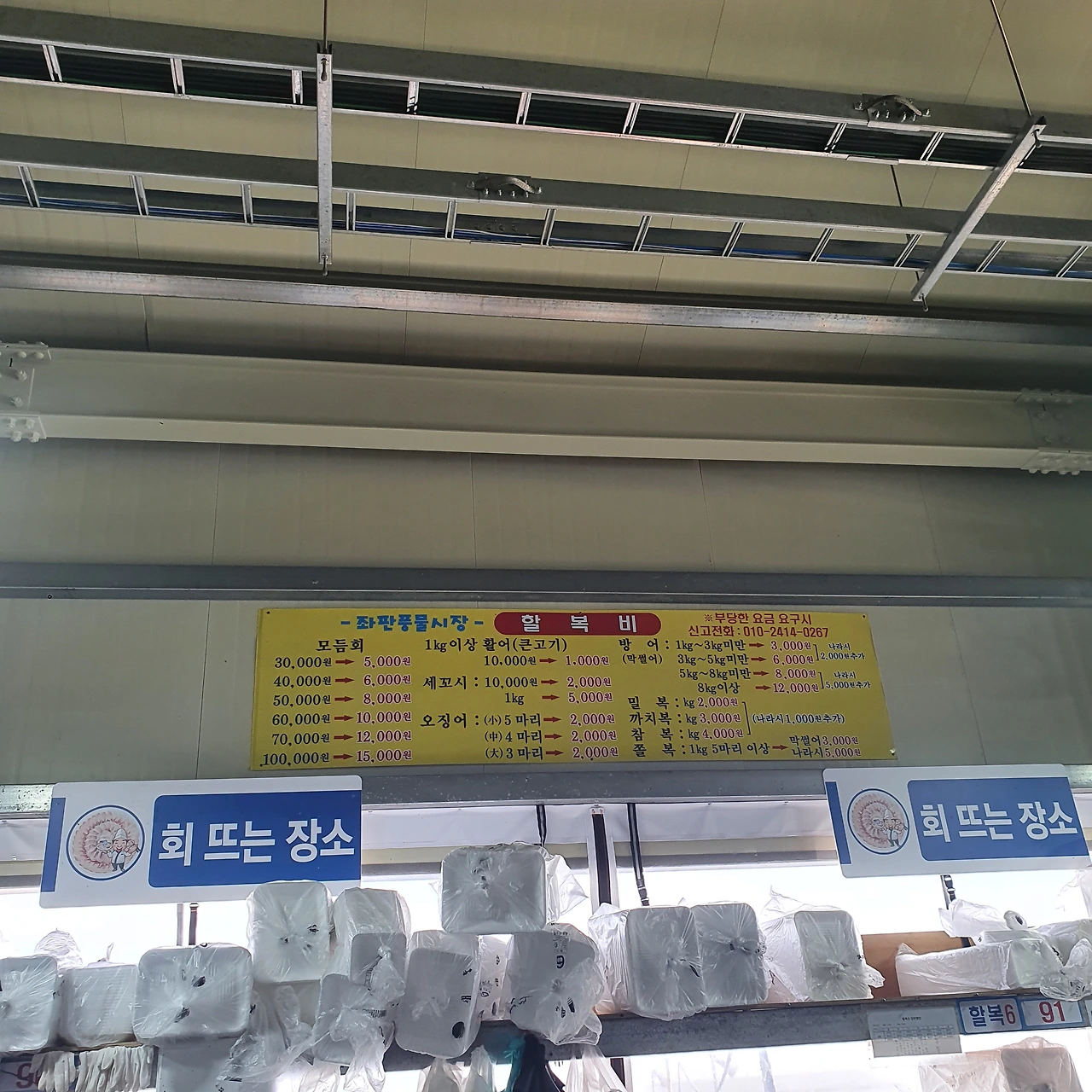 보시다시피 회의 가격에 따라 할복비를 받고 있는 형태였는데요, 생선 파는 곳과 회 뜨는 장소를 따로 둠으로써 회전율도 빠르고 위생에 더 신경 쓸 수 있지 않을까 하는 기대감이 있었습니다. 수돗물을 이용해 위생적으로 처리하는 모습은 아주 좋았지만, 여전히 회 뜨는 손으로 돈을 받거나 하는 모습은 아쉬웠습니다. 이런 기본적인 위생에 대해서는 대책이 더 필요할 듯싶었습니다.