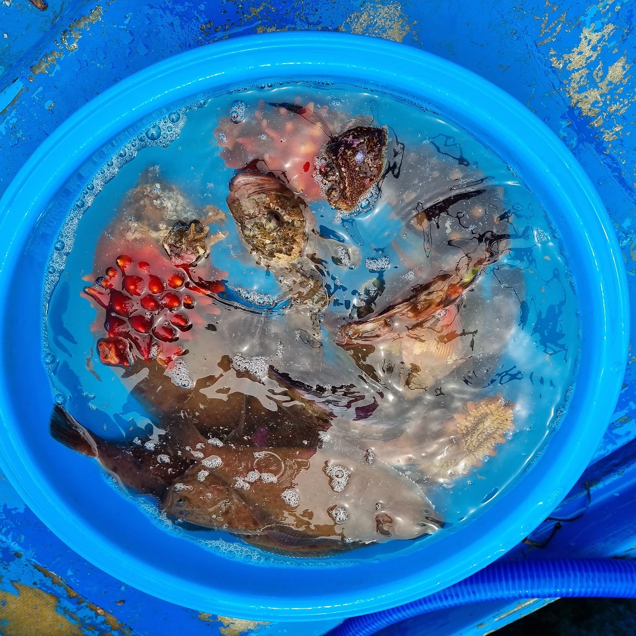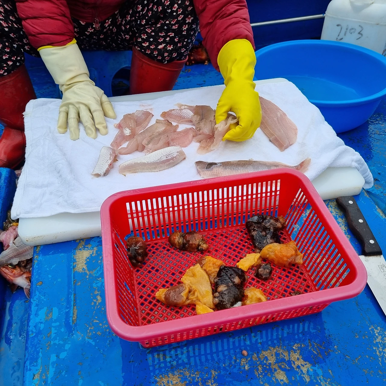 선내에서 할복 및 손질이 진행됐습니다. 이때도 민물이 준비되어 위생적으로 괜찮았습니다. 돈도 다 끝나고 장갑 벗고 받으셔서 교차 오염은 없었는데요, 하지만 중간에 전화가 와서 어쩔 수 없이 폰을 만지시게 되시더라고요. 이해는 가지만 아쉽기도 한 느낌을 받았습니다. 이날 할복하면서 사모님과 선장님께서 여러 가지 이야기를 해주셨습니다. 해삼의 경우 그물에 기어 들어오는 거라 괜찮지만 멍게의 경우는 박혀있는 것이 뽑혀 올라오는 거라 그물이 망가져서 멍게가 잡히는 걸 선호하지 않는다고 하시더군요. 또 그물 작업하느라 배를 안 띄우는 경우나 고기를 빼둘 수 있으니 올 거면 미리 연락하고 오라는 말씀도 해주셨습니다. 이날 탕거리도 대게 같은 걸 더 챙겨주시려고 했는데 숙소가 호텔인지라 고사했습니다. 개인적으로 정말 아쉬웠네요 ㅎㅎ.