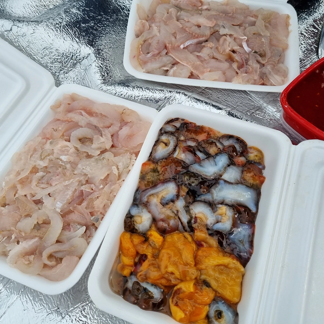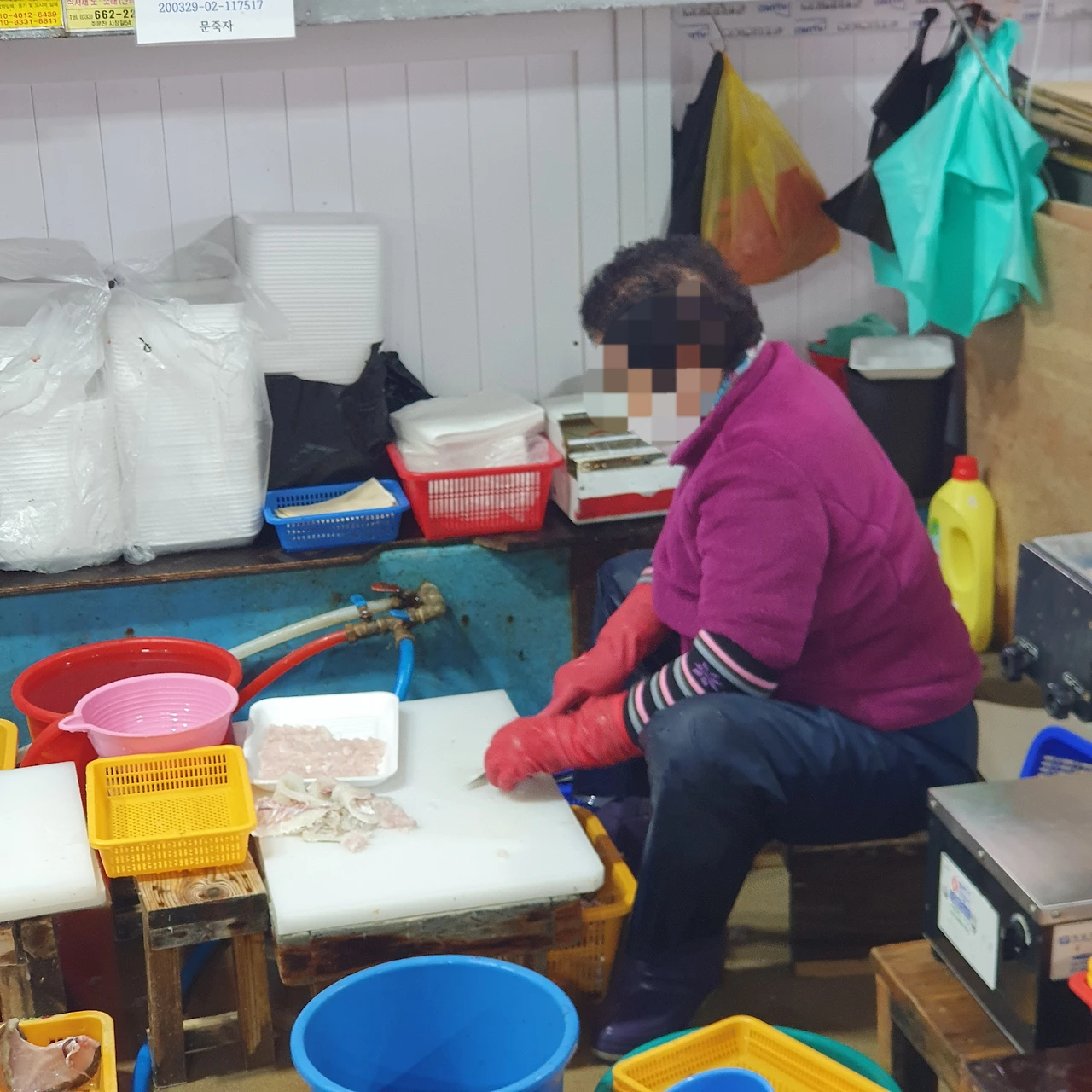 이날은 다른 곳에서 회를 떴는데, 이날 할복은 만족스러웠습니다. 마찬가지로 민물이 상시 준비되어 있기도 했고 지난번보다 회가 더 잘 떠졌단 느낌도 받았습니다. 다만 이번에도 약간 아쉬웠던 건 역시도 돈거래 시 발생하는 상황이었습니다. 돈통을 두고 자율 거래 방식이 가장 오염으로는 안전하지만, 보안을 생각했을 때 무리가 있다 느껴졌습니다. 대신 이날 이미 시장에서 많이 시행되던 계좌이체가 활발하게 사용된다며 위생 측면에서 도움이 되겠단 생각을 했습니다. 그렇지만 시장을 찾으시는 분들 중 계좌 이체가 익숙하지 않은 분들도 계시기에 현금을 받는 건 필연적이라는 생각이 들더군요. 하지만 돈을 받을 때 번거롭더라도 교차오염이 방지될 수 있도록 신경을 더 쓴다면 고객들이 더욱 시장을 애용할 수 있을 것 같습니다.