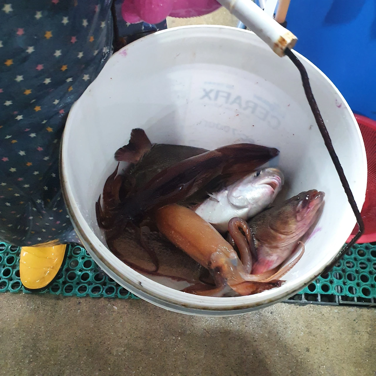 상인분께 좀 지역 색깔이 드러난 회를 추천받았는데, 3월까지가 철이라던 장갱이라는 이름의 생선이었습니다. 학술명으로는 장치인 생선입니다. 강릉 하면 유명한 장치찜의 그 장치이고, 살에 수분이 많아 회보다 찜류가 더 어울리는 어종입니다. 그래도 호기심에 장치 한 마리, 키로가 조금 넘어가는 도미, 강도다리 한 마리를 묶어서 구매했습니다. 오징어도 한창 철이라 씨알 좋은 녀석으로 두 마리 구매했네요.