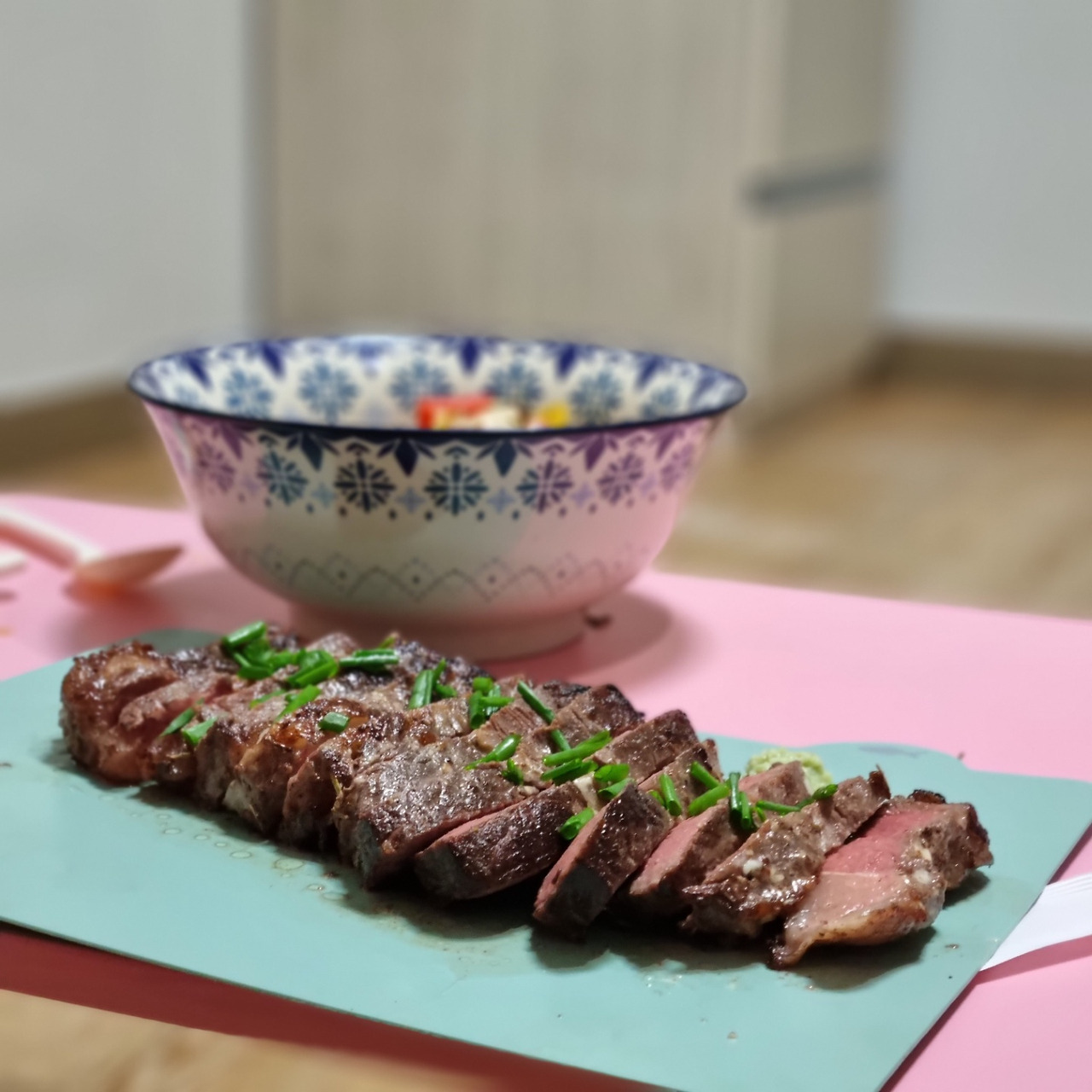 저 단면이 보이시나요? 안이 덜 익거나 겉 부분이 과도하게 익거나 하지 않고 안이 고르게 미디엄으로 익었습니다. 많은 팬 프라잉 스테이크를 해보았지만, 이 정도 균일한 익힘을 가지고 있는 결과물은 처음이었습니다. 특히 3.5 cm 두께 정도가 되면 고루 익히기가 정말 어려운데, 난이도도 쉽고 결과물도 좋아서 굉장히 놀라웠습니다.