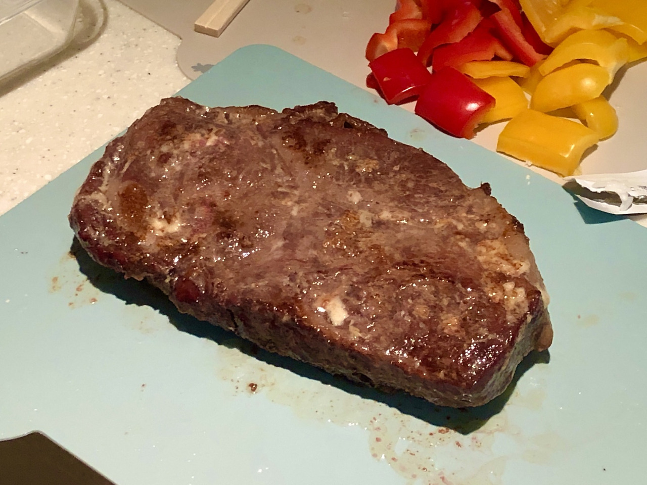 총 두 덩어리를 리버스 시어링을 했다고 말씀드렸는데, 위 사진은 수비드를 먼저 해준 고기입니다. 사실 수비드 과정을 거치 다 보니까 육즙이 많이 빠져서 큰 기대는 하지 않았는데, 먹은 후에는 평가가 완전히 뒤바뀌게 되었습니다. 분명히 수비드 조리 과정 중 육즙 손실은 많았지만, 식감에 명백한 차이가 날 정도로 부드러웠습니다. 특히, 미국산 채끝이 마블링이 많기보다는 좀 치감이 있는 부위지만, 수비드로 조리하니 폭발적인 육즙은 부족했지만 누구나 먹을 수 있을 정도로 연해졌습니다. 하지만 두 조리법 모두 장점을 갖고 있기 때문에, 둘 중 더 편한 걸 선택하셔도 충분히 맛있는 스테이크를 즐기실 수 있습니다.