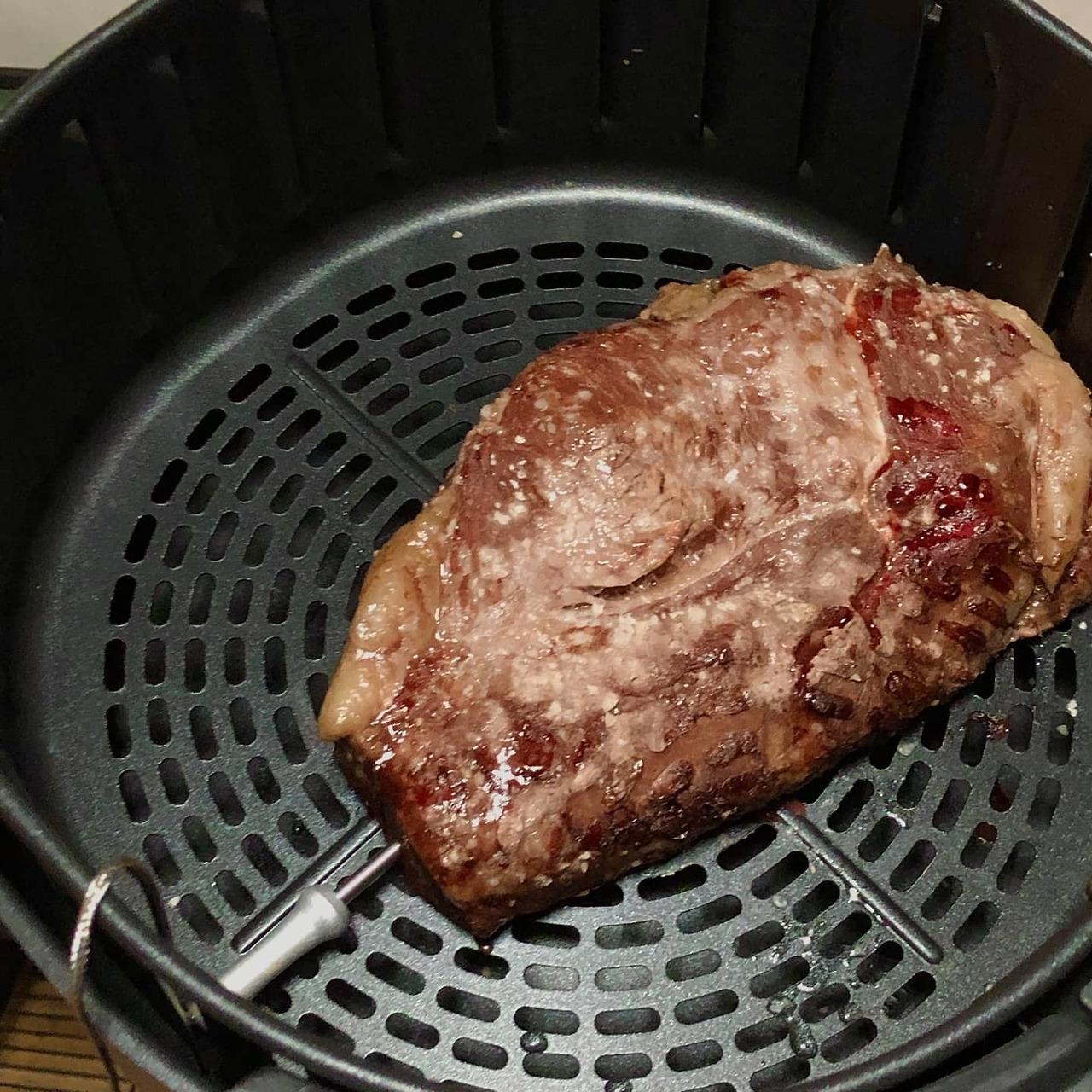 정말 간단합니다. 소금 간을 하고, 안을 고루 익힐 수 있는 여러 가지 기구를 통해 적정 익힘 온도만 익혀준 후, 짧은 시간 겉면만 시어링(지지는 행위)을 해주면 끝입니다. 안을 고루 익히는 도구는 오븐, 에어프라이어, 수비드 머신 모두 가능하며, 난이도는 약간 올라가지만 심지어는 전자레인지도 충분히 요리를 할 수 있습니다. 다만, 이 리버스 시어링을 몇 분 익히라는 조언을 드리기는 어렵습니다. 리버스 시어링은 몇 분간 돌려주느냐가 중요한 것이 아니라 심부 온도를 몇 도 정도로 만드느냐가 핵심인 조리법이기 때문입니다. 그러면 심부 온도를 어떻게 재야 하는지가 쟁점일 텐데요, 사실 이 부분은 심부 온도계를 이용하는 수밖에 없습니다. 집에 심부 온도계가 어딨냐고 생각하시는 분이 있으실 것으로 생각됩니다. 당연합니다. 저도 그렇게 생각했었거든요 ㅎㅎ... 하지만 제가 고기를 정말 좋아하기에 하나 장만을 했습니다. 가격대도 만원 초중반이라 큰 부담이 되지 않는데 굉장히 유용해서 아주 만족하는 소비 중 하나입니다. 고기 요리를 자주 해주시는 분들께는 하나 장만하시는 것을 추천드립니다. 다시 본문으로 돌아와서, 저는 리버스 시어링을 수비드 머신과 에어프라이어를 통해 만들어보았습니다. 고기는 미국산 채끝을 3.5센티 정도의 두께로 준비했으며, 냉장고에서 꺼낸 직후의 심부온도는 약 8도쯤이었습니다. 수비드 머신은 56.5도에서 1시간 20분 정도 돌려주어서 심부온도를 56도 정도로 맞춰주었고, 에어프라이어는 80도에서 40분 정도를 익혀주어서 심부온도 53도를 맞춰보았습니다. 에어프라이어 같은 경우 고루 익히기 위해 20분 정도 지났을 때 고기를 한번 뒤집어줬습니다. 수비드 머신에서는 정석적인 요리법을 따르느라 56도를 하긴 했지만, 다른 조리 기구를 이용해 익히실 때에는 심부온도를 52도에서 53도 사이로 맞추시는 것을 추천드립니다.