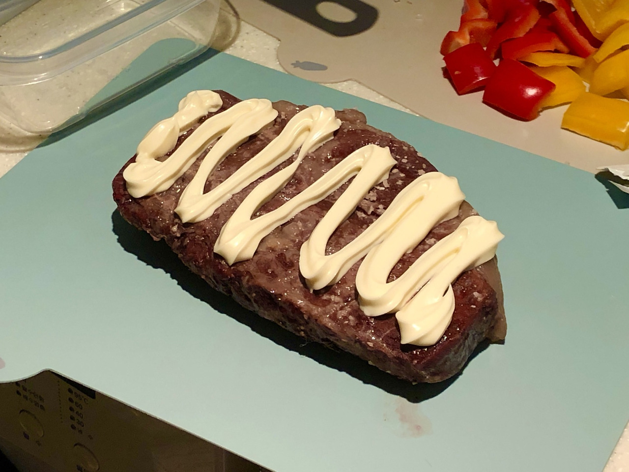 보통은 달군 팬에 기름, 버터 등을 올리고 시어링을 해주는 편이지만, 이번에는 최근 인기를 끌었던 마요네즈를 통해 시어링을 해보았습니다. 저도 이 조리법을 들었을 때 스테이크에 웬 마요네즈인가 싶었는데, 마요네즈의 구성 성분인 계란, 기름, 식초, 소금 등이 스테이크와 조화가 나쁘지 않은 걸 생각하면 잘 어울릴 것 같단 생각이 들었습니다. 맛도 맛이지만, 예쁜 골든 브라운 색깔의 시어링을 쉽게 내기 위한 방법으로 마요네즈를 사용하는 것이라 의심반 기대 반 마요네즈를 이용해보았습니다. 마요네즈를 바른 앞뒤를 각각 1분씩, 옆면을 30초씩 구워주었습니다.