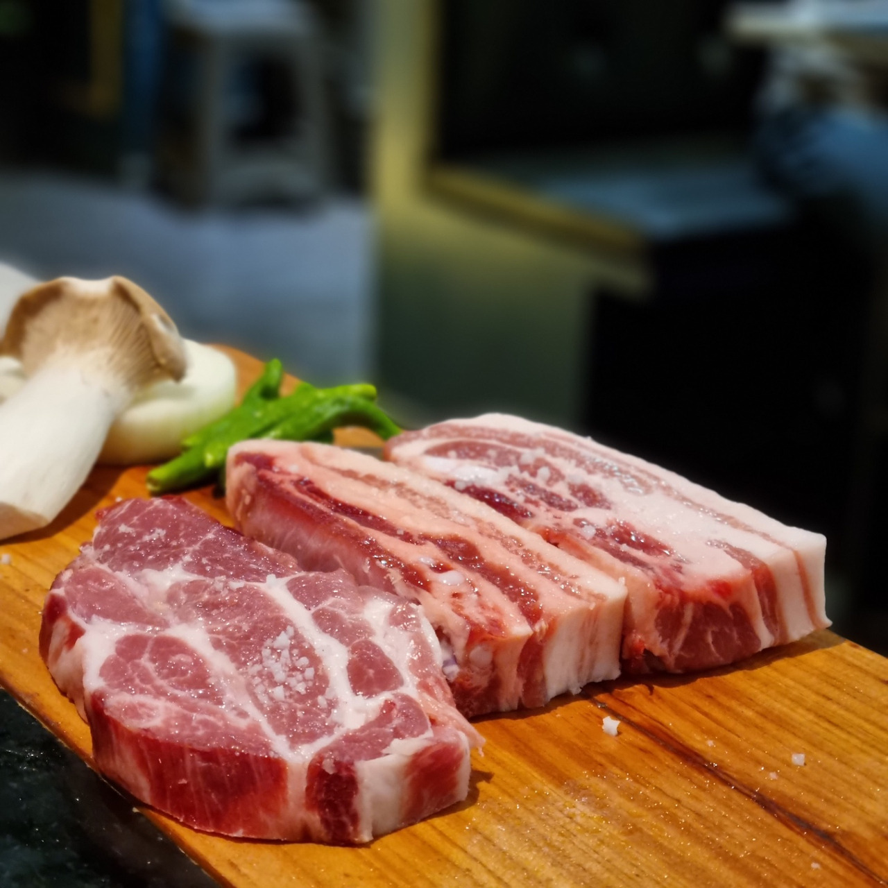 보시다시피 굉장히 두툼하면서 마블링이 굉장히 골고루 퍼져있습니다. 이베리코 삼겹살은 없을까 해서 여쭤봤는데, 맛이 별로라서 목살만 취급한다는 답변을 받았습니다. 사진상으로는 잘 드러나지 않지만, 꽤 육색이 진합니다. 소고기가 생각나는 색이었습니다.
