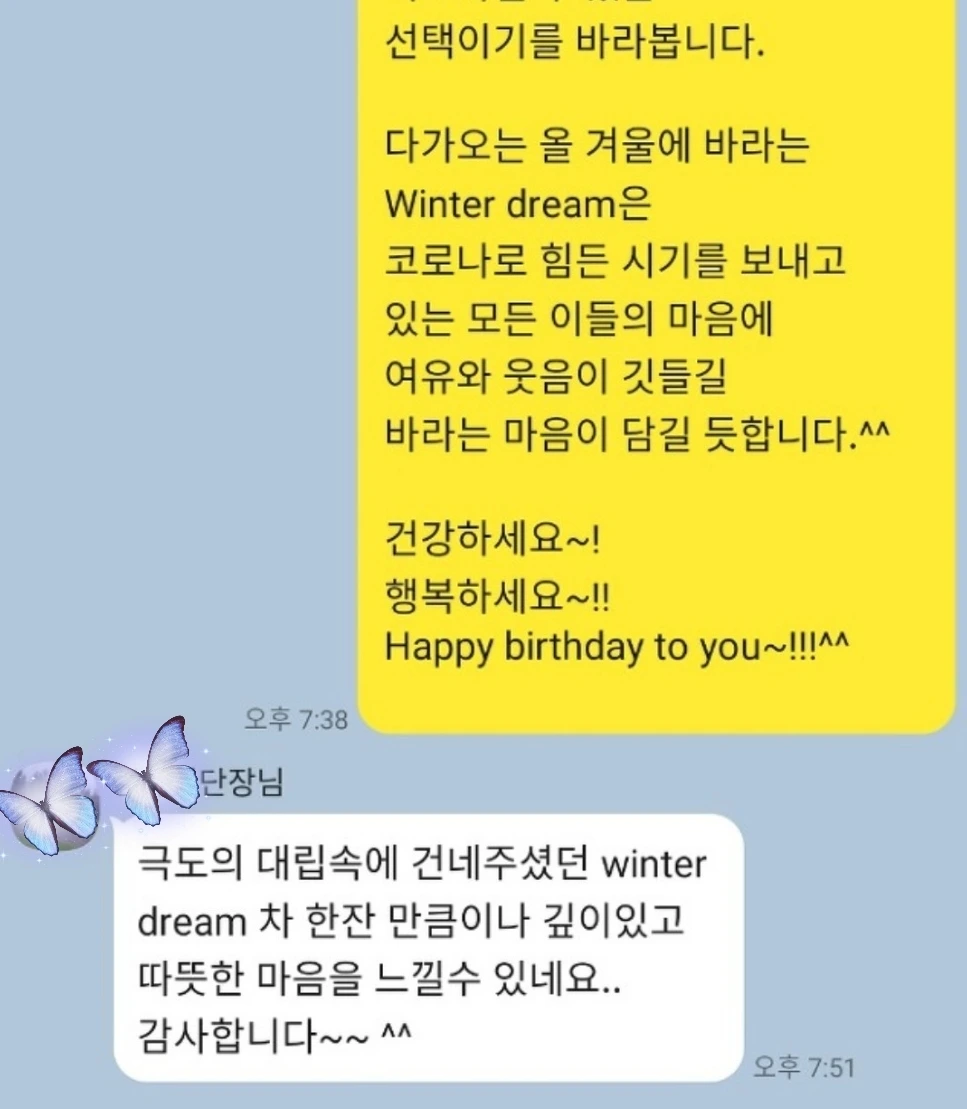그분에게서 처음 받았던 메시지였습니다. 저를 유일하게 'winter dream'이라고 부르는 이유, 저 짧은 대화 내용 속에는 다음과 같은 비하인드 스토리가 있습니다.