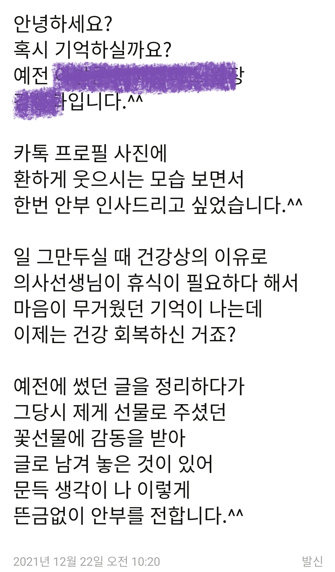 지난 연말, 한 해를 돌아보며 지난 인연들을 떠올리다 문득 그분이 생각났습니다. 가끔씩 카톡 프사가 바뀌는 걸 보니 전화번호는 그대로인 듯했습니다.