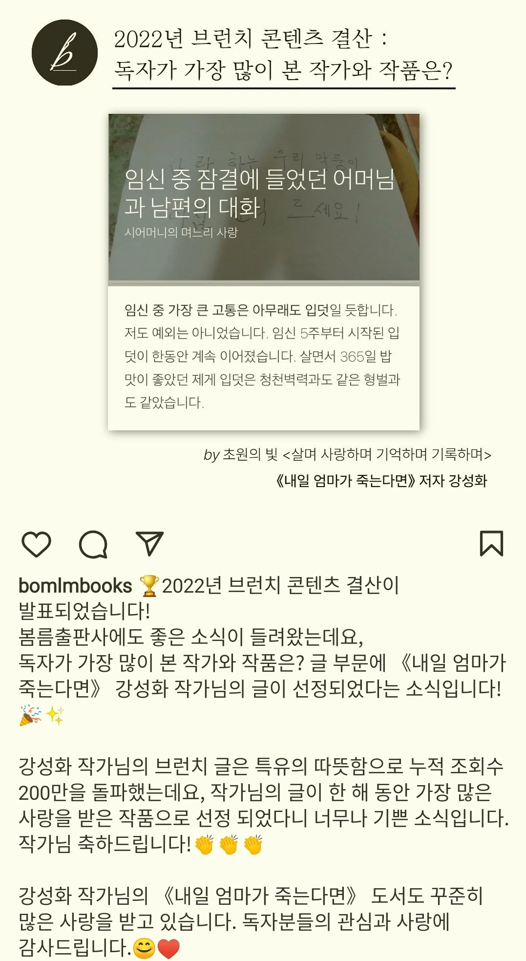 누군가의 삶에 조금이나마 기여할 수 있는 그런 기회가 주어진 것에 그저 감사할 뿐이라고 마음을 전했습니다. 브런치가 준 선물을 보면서 좋은 일 많이 하며 살라고 하늘이 이렇게 뜻밖의 선물을 주셨구나.. 란 생각이 들었습니다. 선물 같은 하루였습니다.