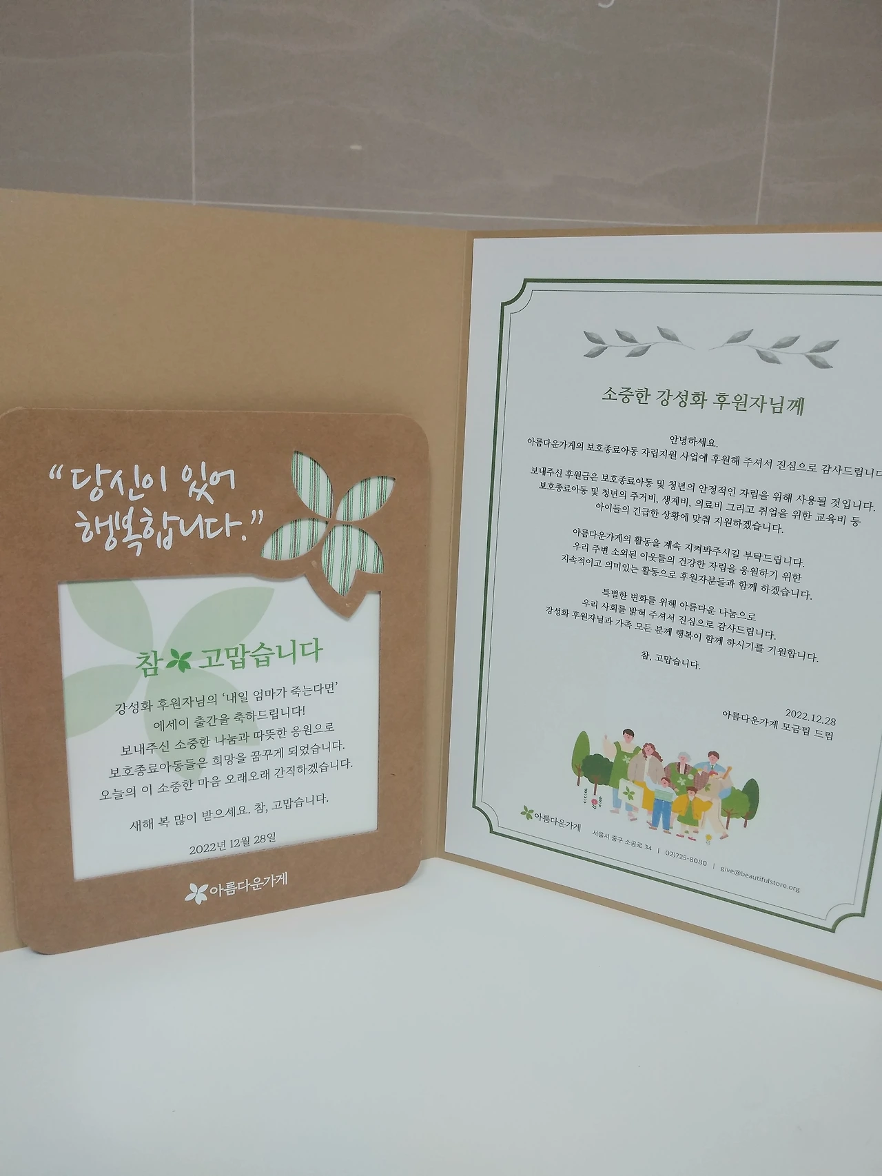 사실 아침 일찍 우체국 택배가 하나 도착했습니다. 얼마 전에 기부했던 곳에서 증서를 보낸 것입니다. 개인적으로 '보호종료아동 자립'을 위해 매달 기부하고 있는 곳이기도 합니다. 지난해 받은 인세로 작으나마 마음을 더하고 싶었던 것인데 따뜻한 메시지가 담긴 증서를 보니 가슴이 금세 온기로 가득 찼습니다.
