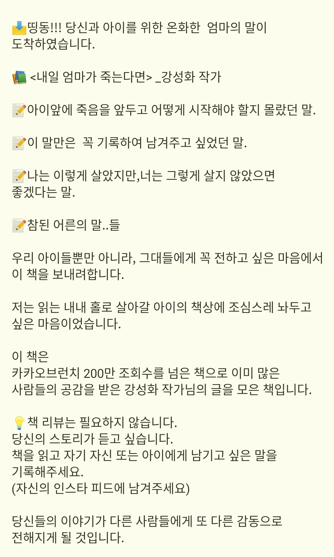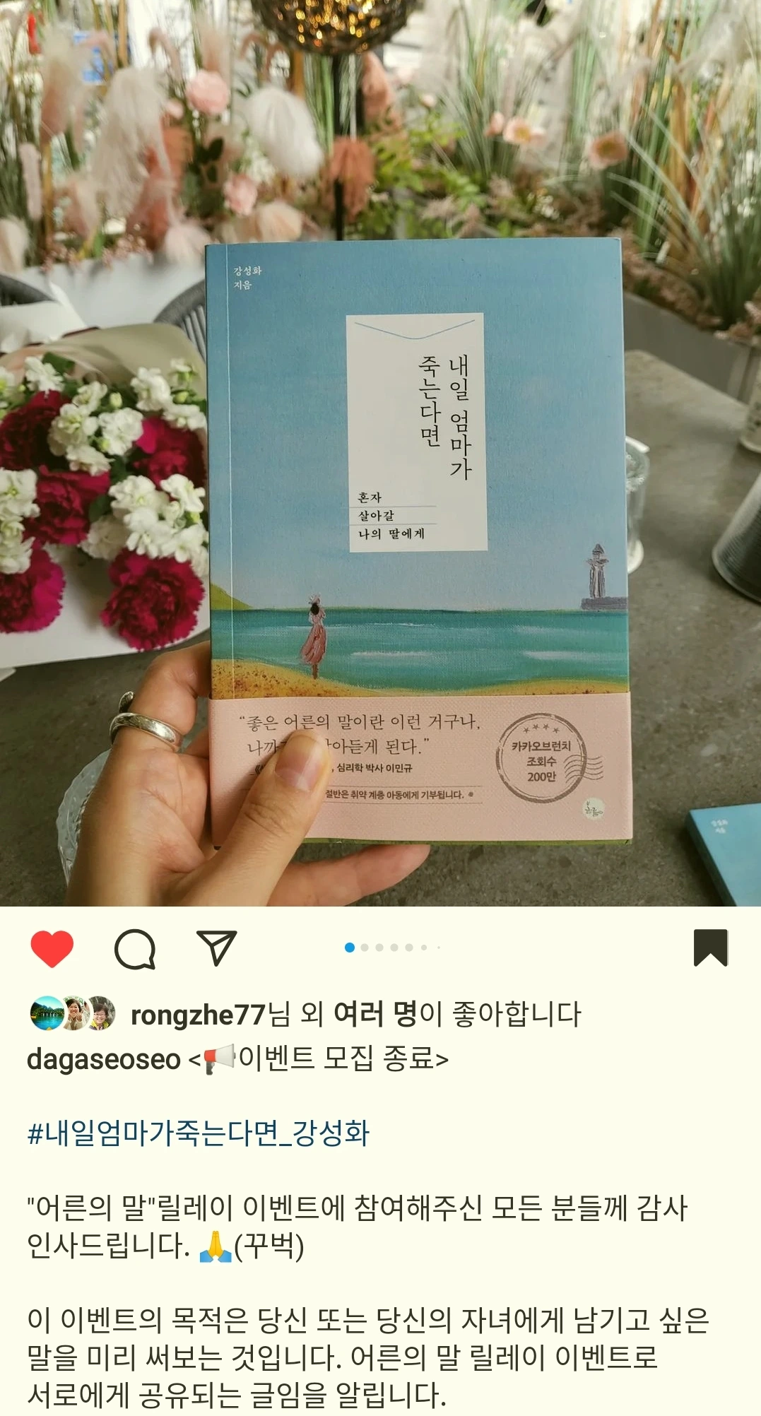 그녀는 부족한 제 책에 담긴 진심을 읽고 더 많은 이들이 읽어야 할 책이라고 말해 주었습니다. 그 마음만으로도 충분히 고마운데 단순한 서평 이벤트가 아닌"어른의 말 릴레이"라는 감동의 이벤트를 제게 제안하며 직접 나서서 기획하고 진행해 주기도 했습니다.