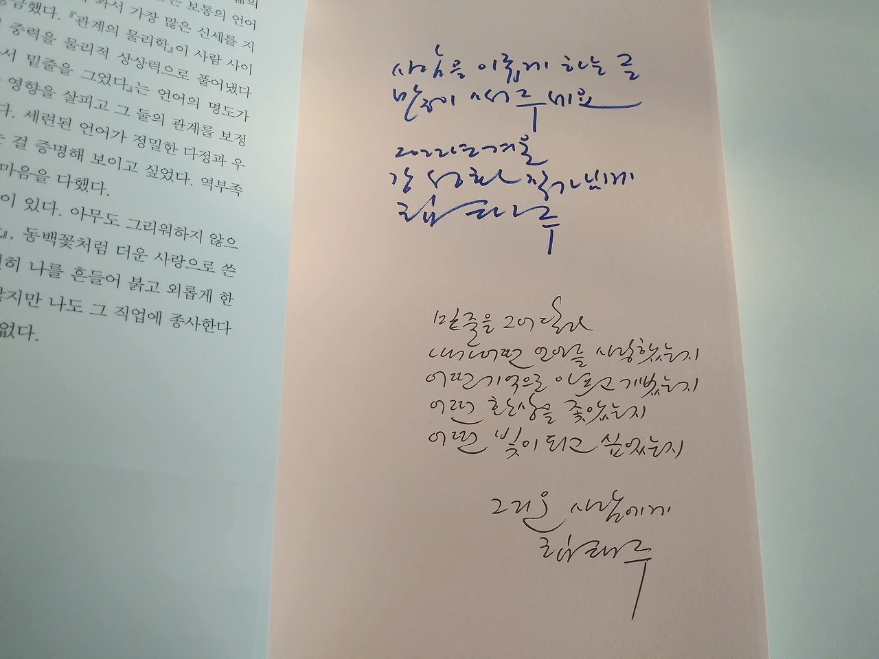 그녀를 만나게 된 건 우연이었습니다. 어느 날 친구가 이병률 작가님의 사인을 받은 책 사진을 보내 주었습니다. 아는 동생이 작가님과 친한 사이라길래 그저 가볍게 "나도 친하고 싶네~!"라고 농담 반 진담 반으로 말했을 뿐이었습니다.
