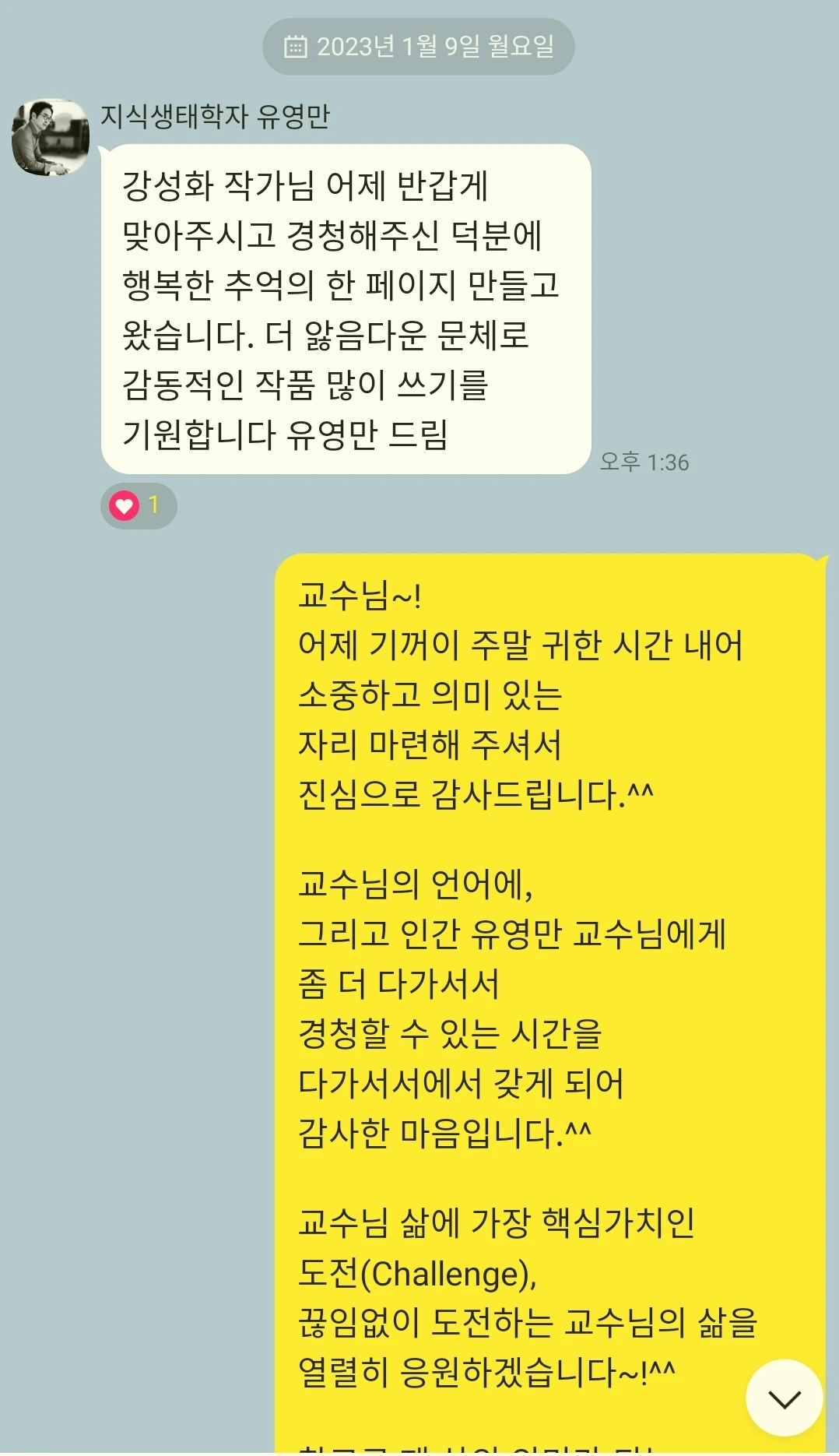 사실 학기 중에 대학원을 다니느라 방학 동안 주말 시간을 가족과 함께 보내려 했습니다. 그런데 공교롭게 12월부터 한 달에 한번 북토크에 참석하느라 그러질 못했습니다. 미안한 마음을 뒤로하고 나설 수 있었던 것은 그녀와의 인연을 잘 알고 있는 남편과 딸의 배려 덕분이었습니다.