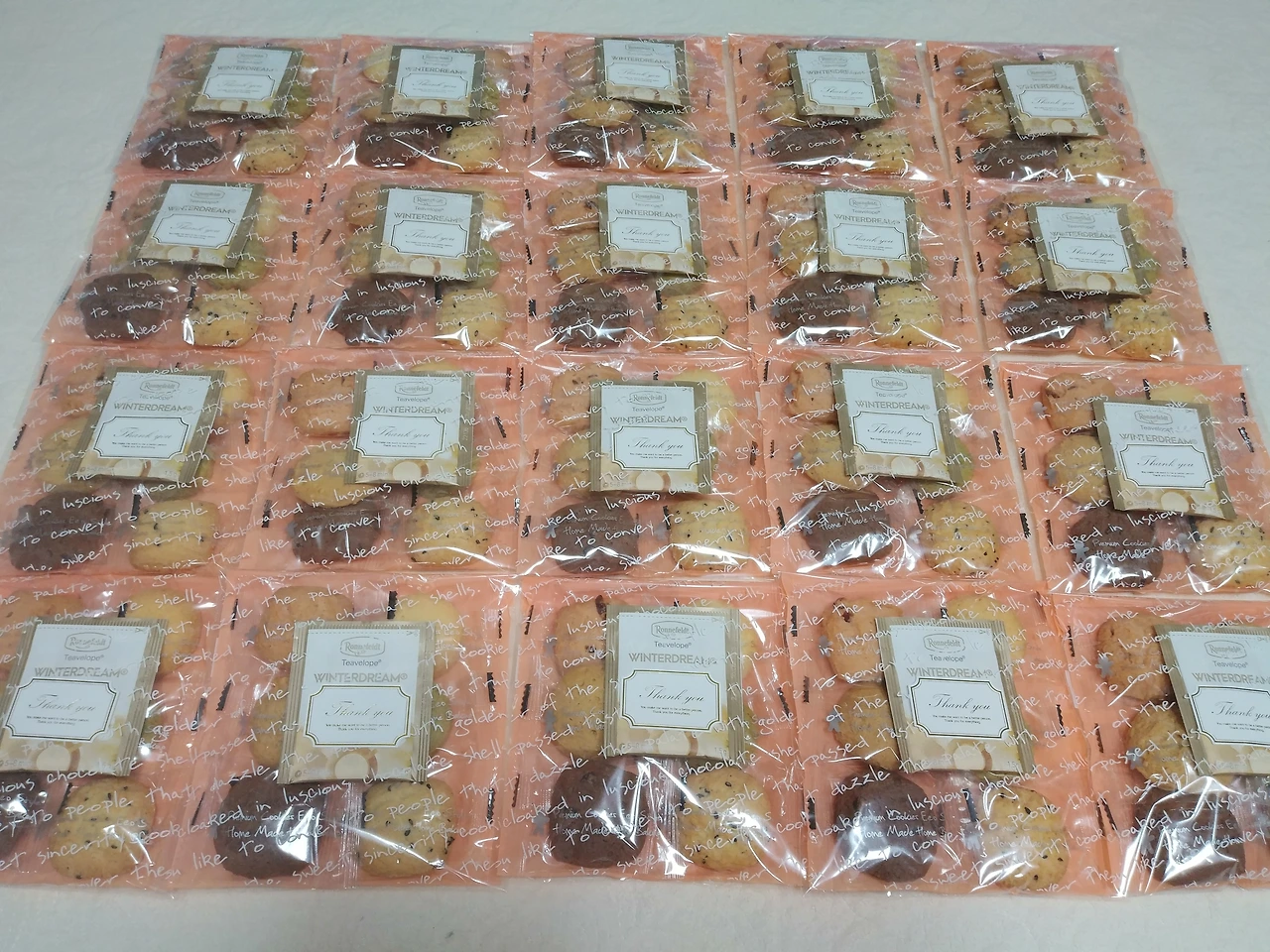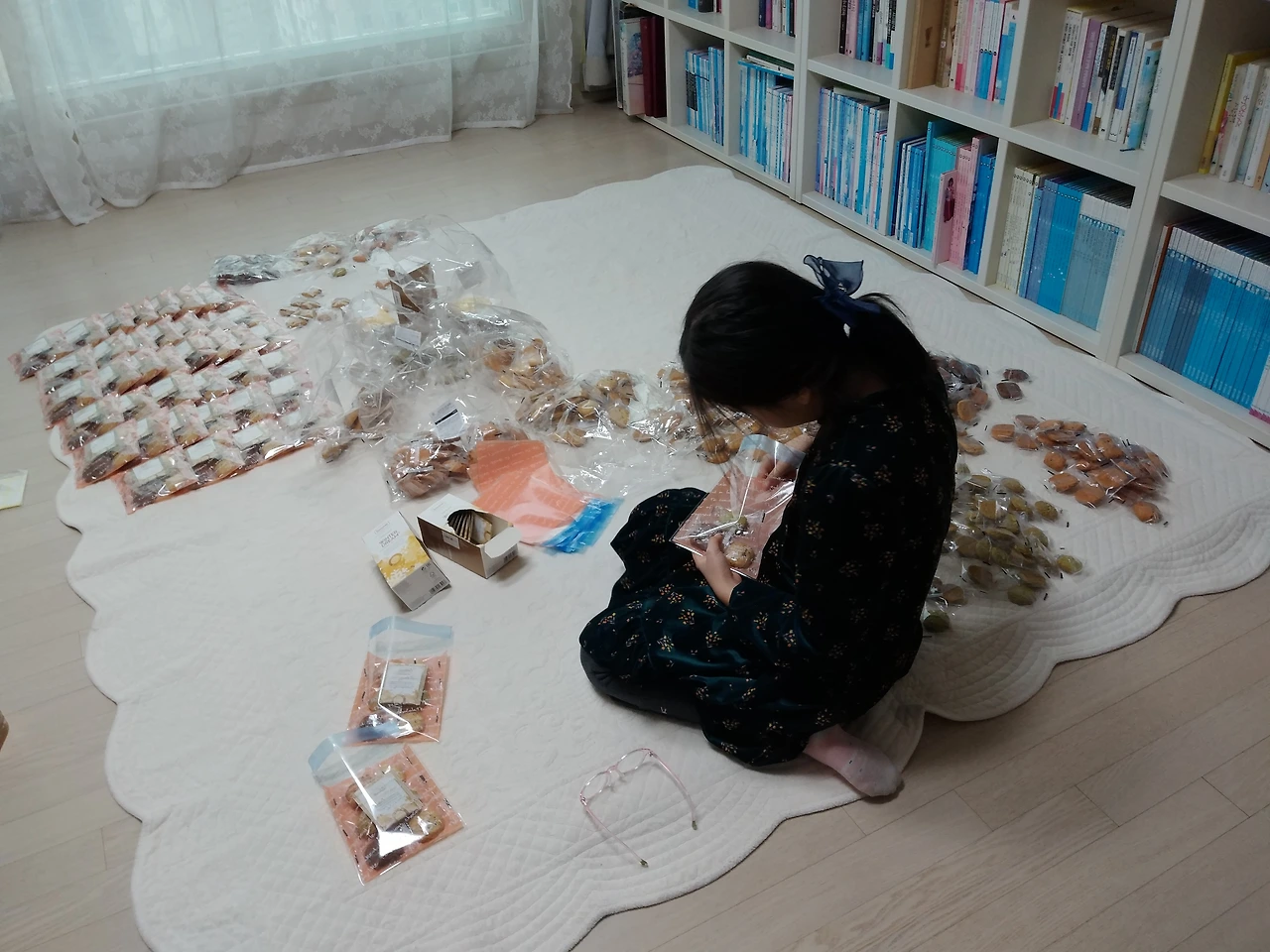 200여 개의 간식을 포장하는 데 걸린 시간은 꼬박 이틀. 딸의 도움이 없었다면 나흘은 걸렸을 것입니다. 몇 번 해봤다고 제법 손이 빨라진 딸. 익숙한 솜씨로 봉투에 쿠키와 차를 담아 주면 전 앞뒤로 'Thank you' 스티커를 붙여 마무리를 했습니다.