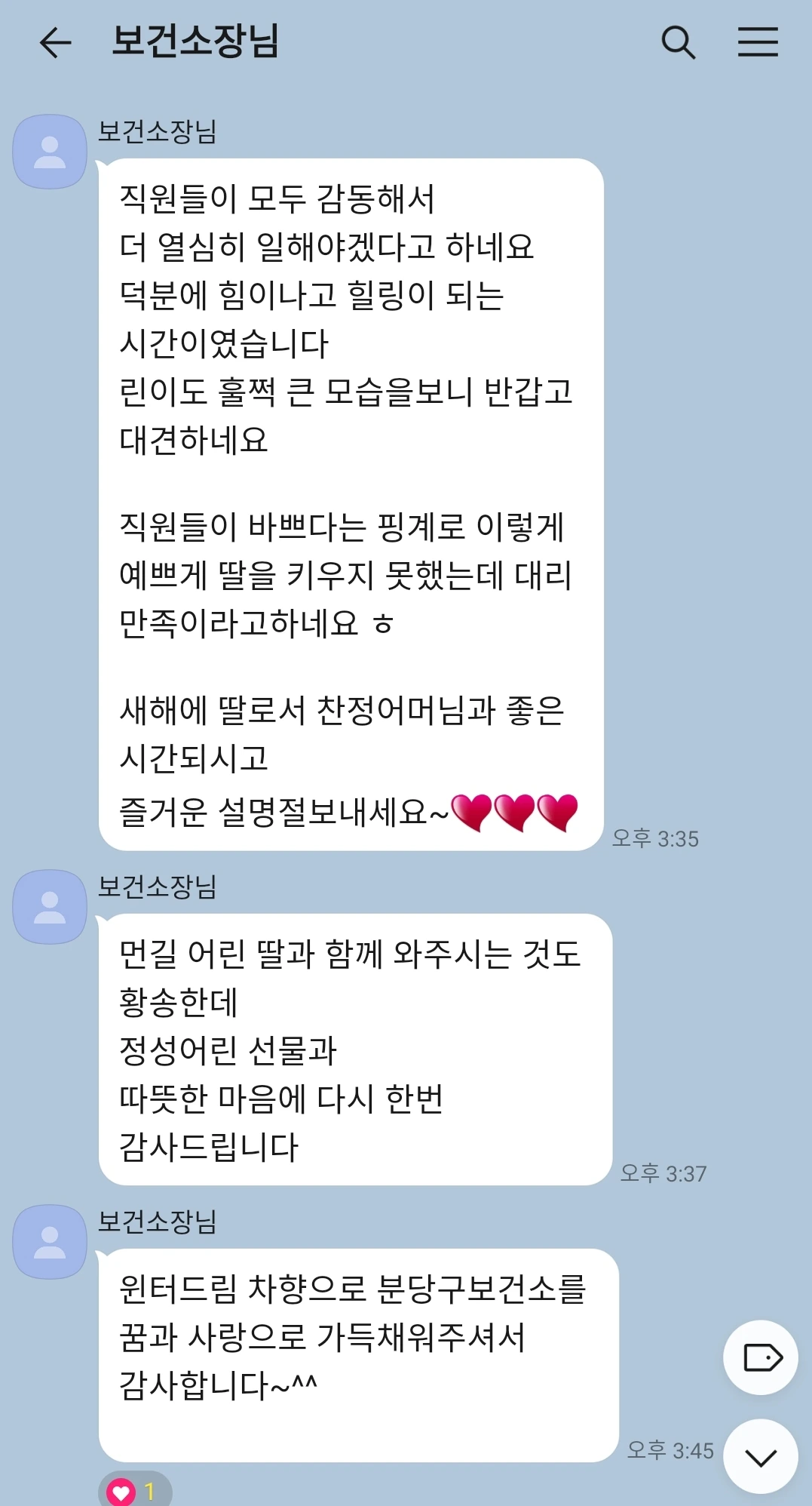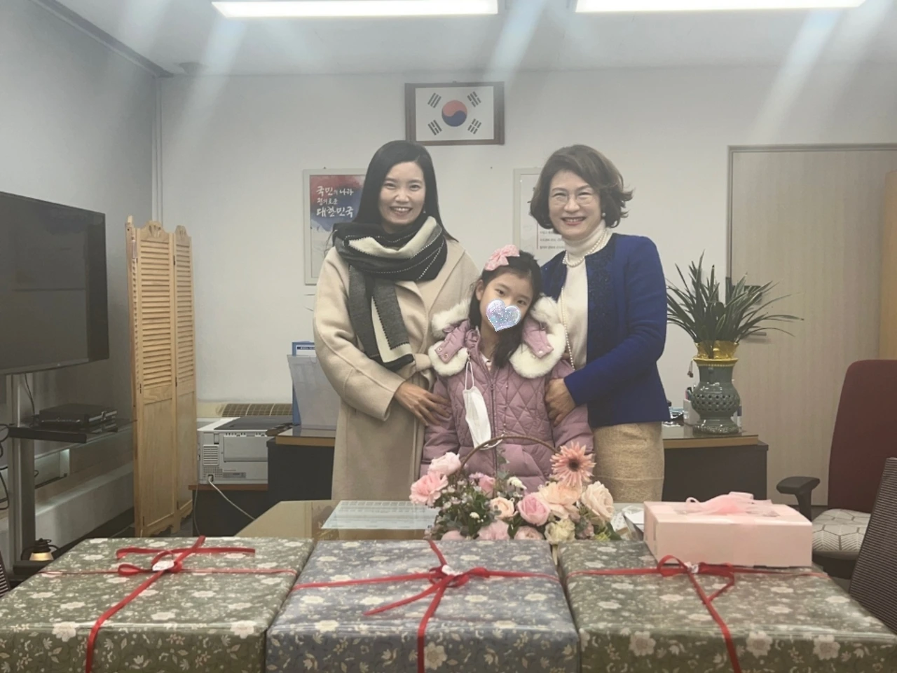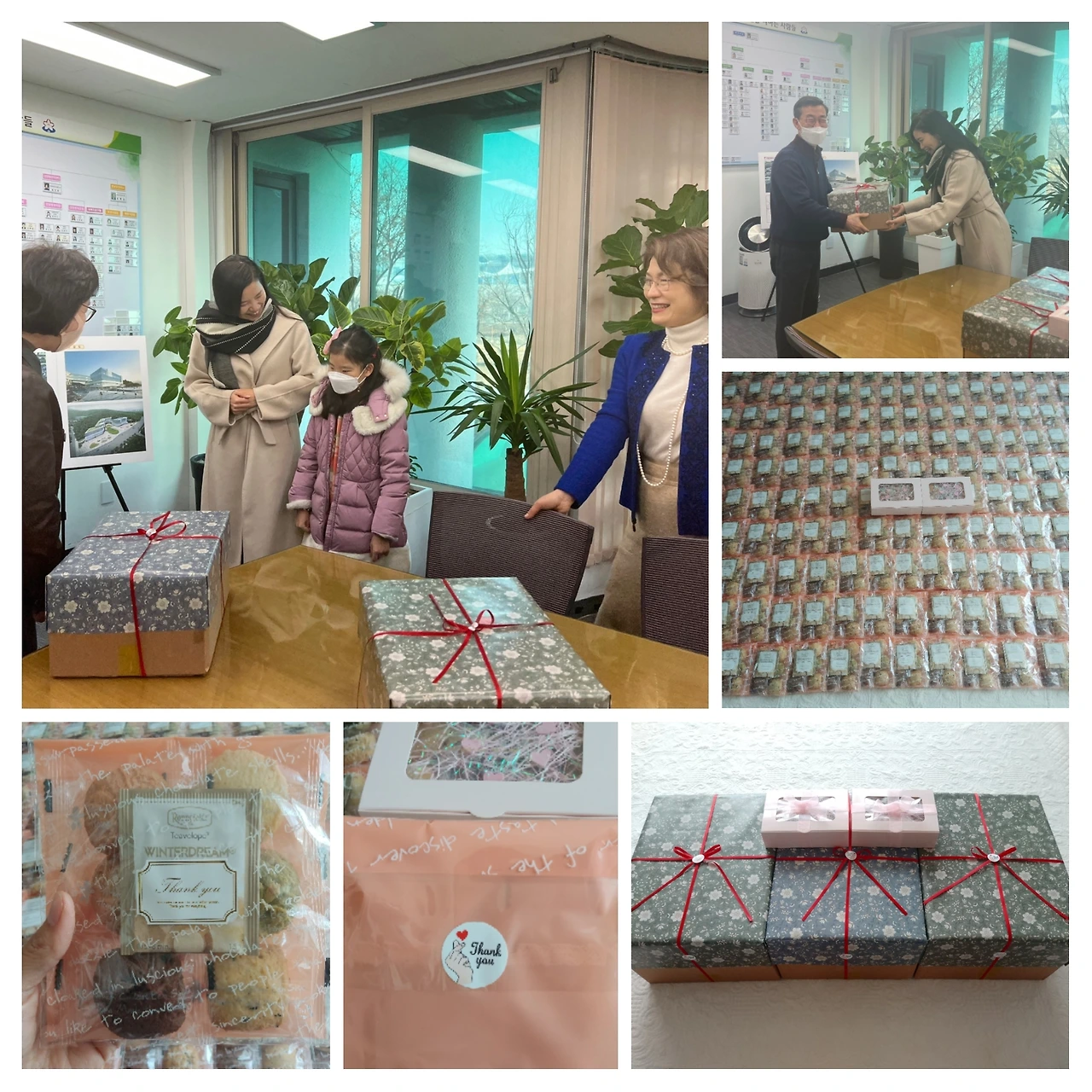 보건소에 도착하자 소장님은 직원 몇 분과 우리를 마중 나와 주셨습니다. 반가운 마음에 소장님을 잠시 꼭 안았습니다. 보건소 직원분들에게 우리 모녀를 소개해 주셨고, 각 부서장님들을 불러 우리가 준비해 온 간식을 직접 받아보게 하셨습니다.