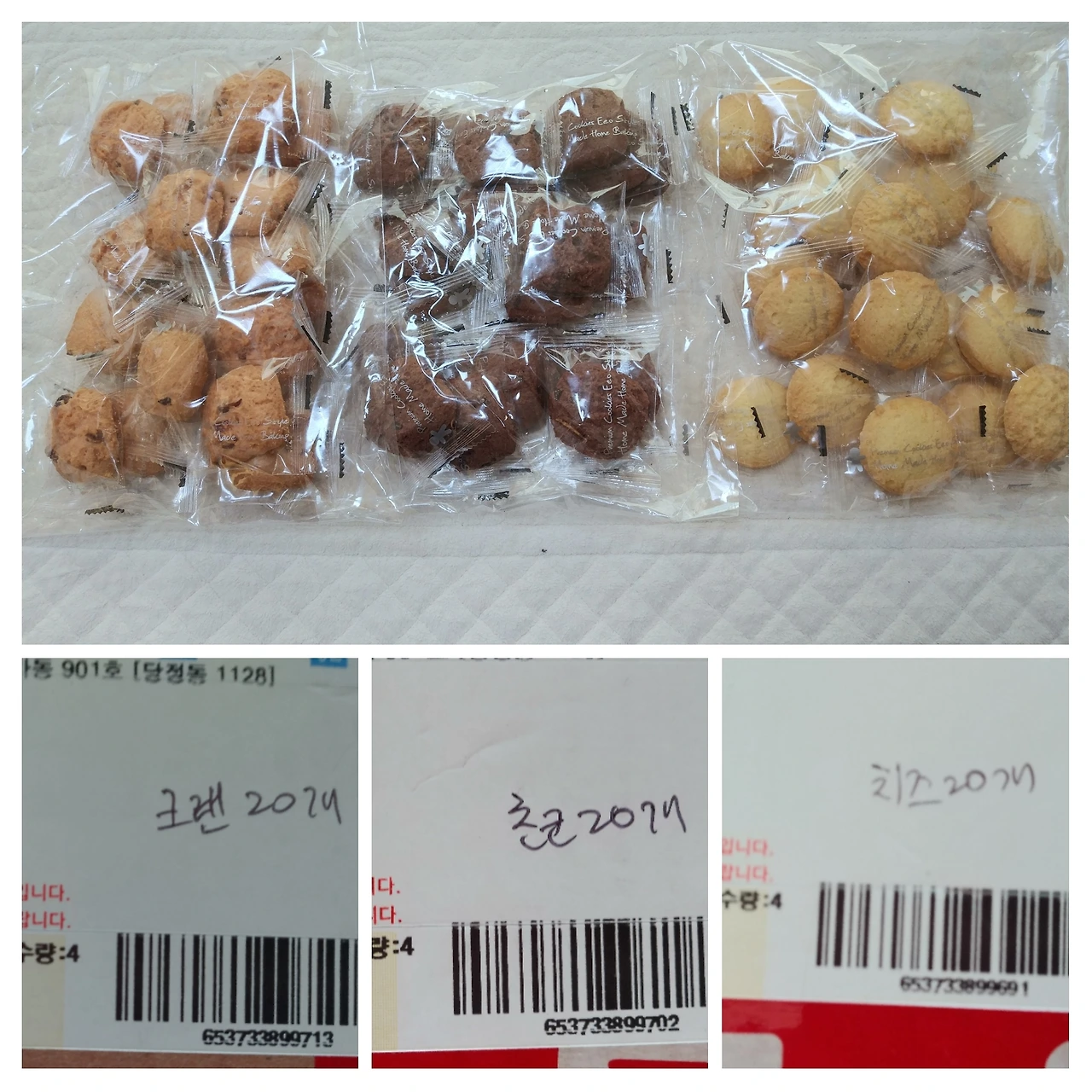 주문한 쿠키가 도착해서 집으로 옮기려는데 순간 감동이 밀려왔습니다. 세 개의 박스에 적혀 있던 메모 때문이었습니다. '크랜 20개, 초코 20개, 치즈 20개' 쿠키 60개는 바로 사장님이 서비스로 주신 것입니다.