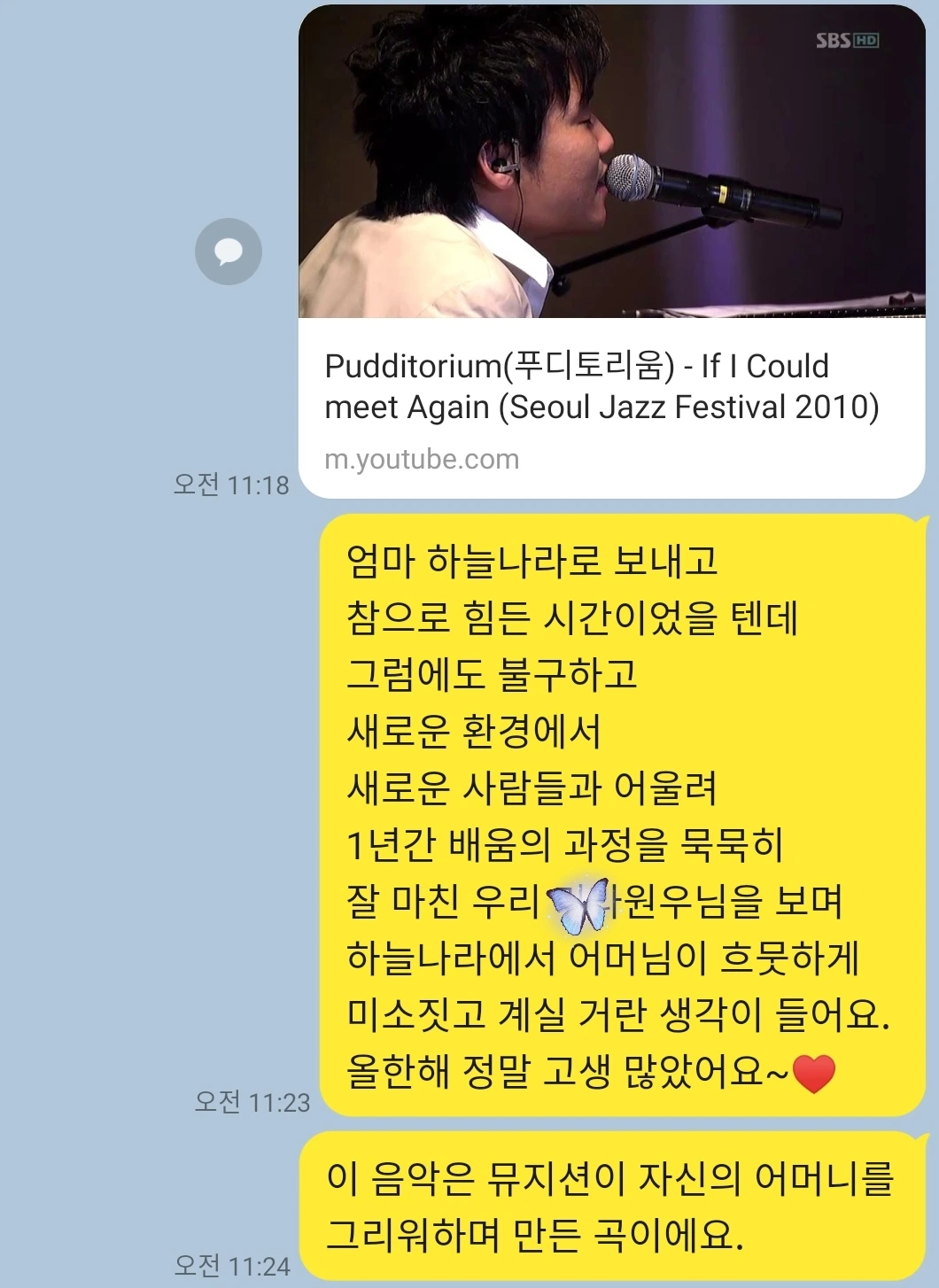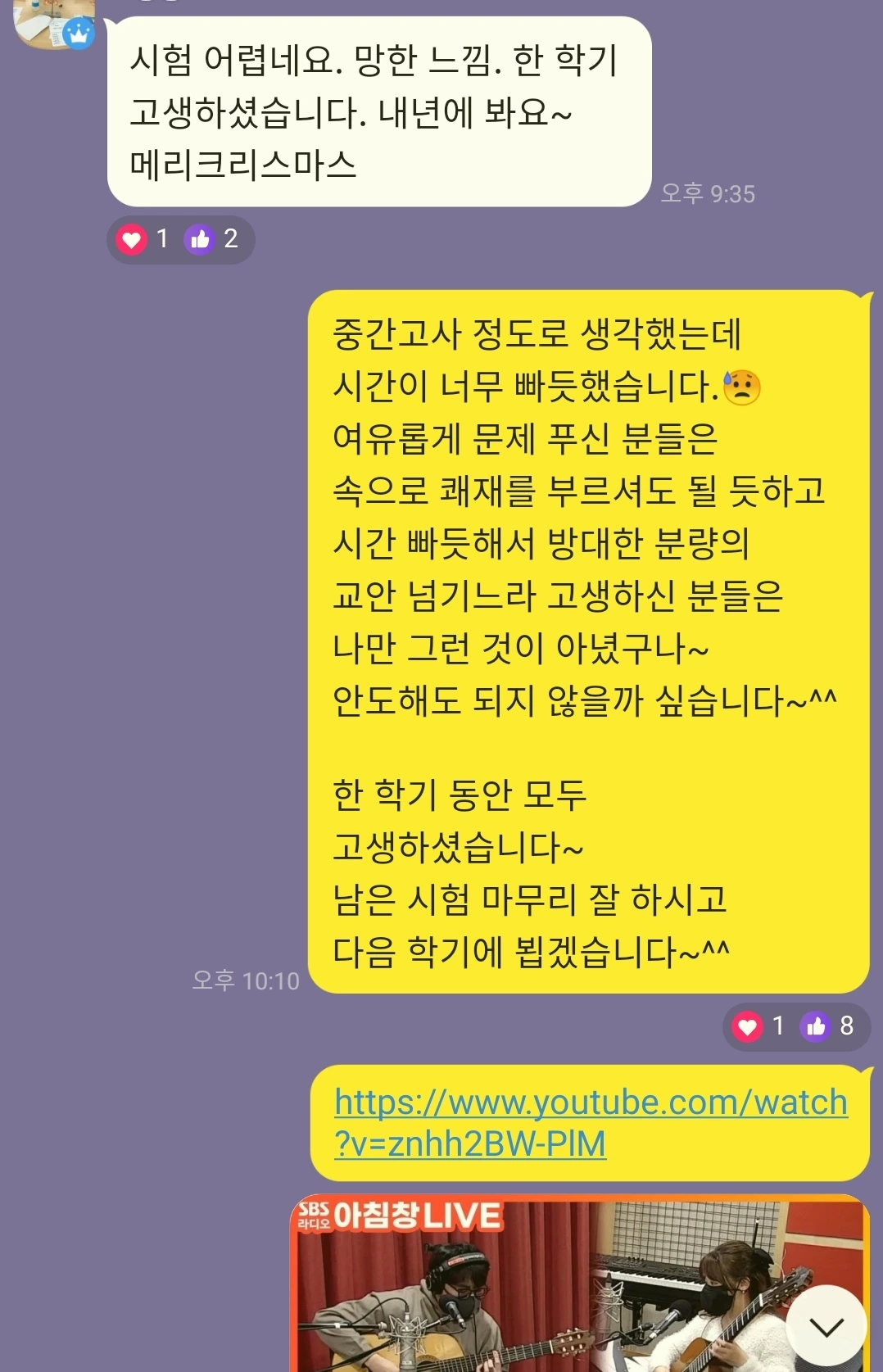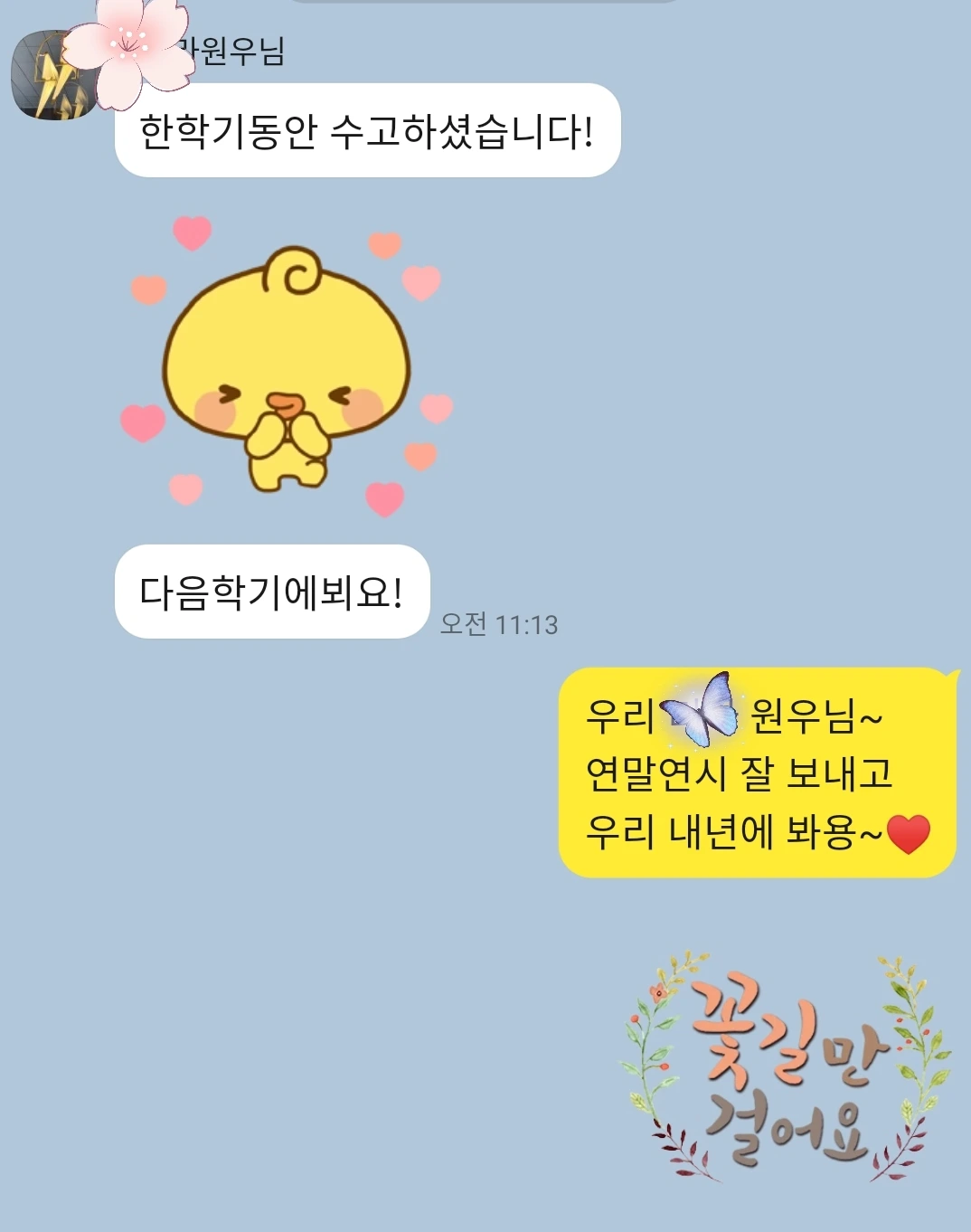 그런 마음을 기억하고 있었는지 지난해 그녀와 함께 들었던 과목의 마지막 강의가 끝난 다음 날 아침, 그녀에게 메시지가 왔습니다. 전날 밤 기말고사가 끝나고 단톡방에 제가 남긴 메시지에 대한 응답이었습니다.