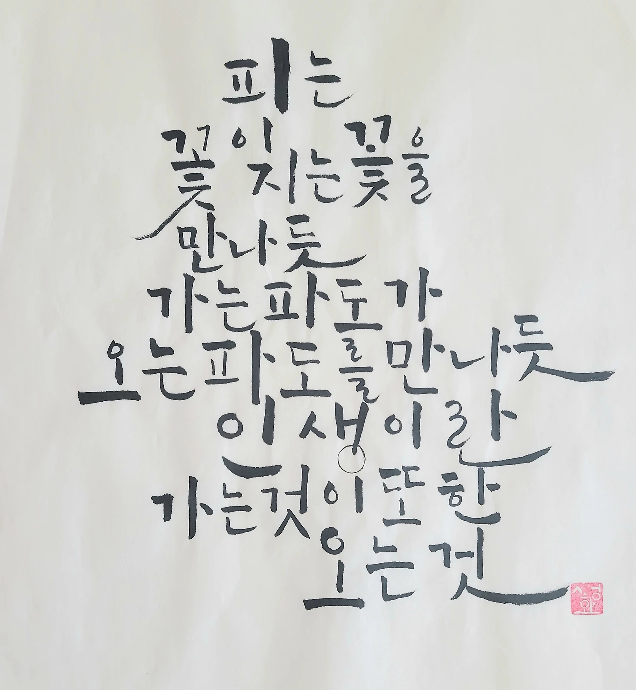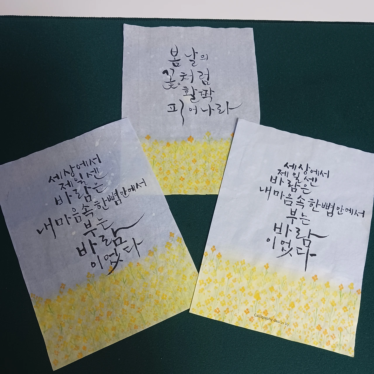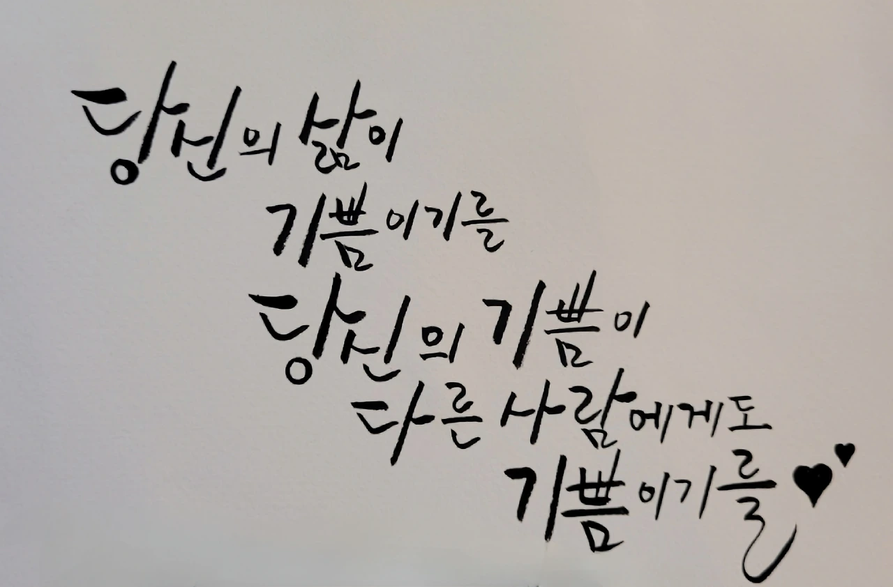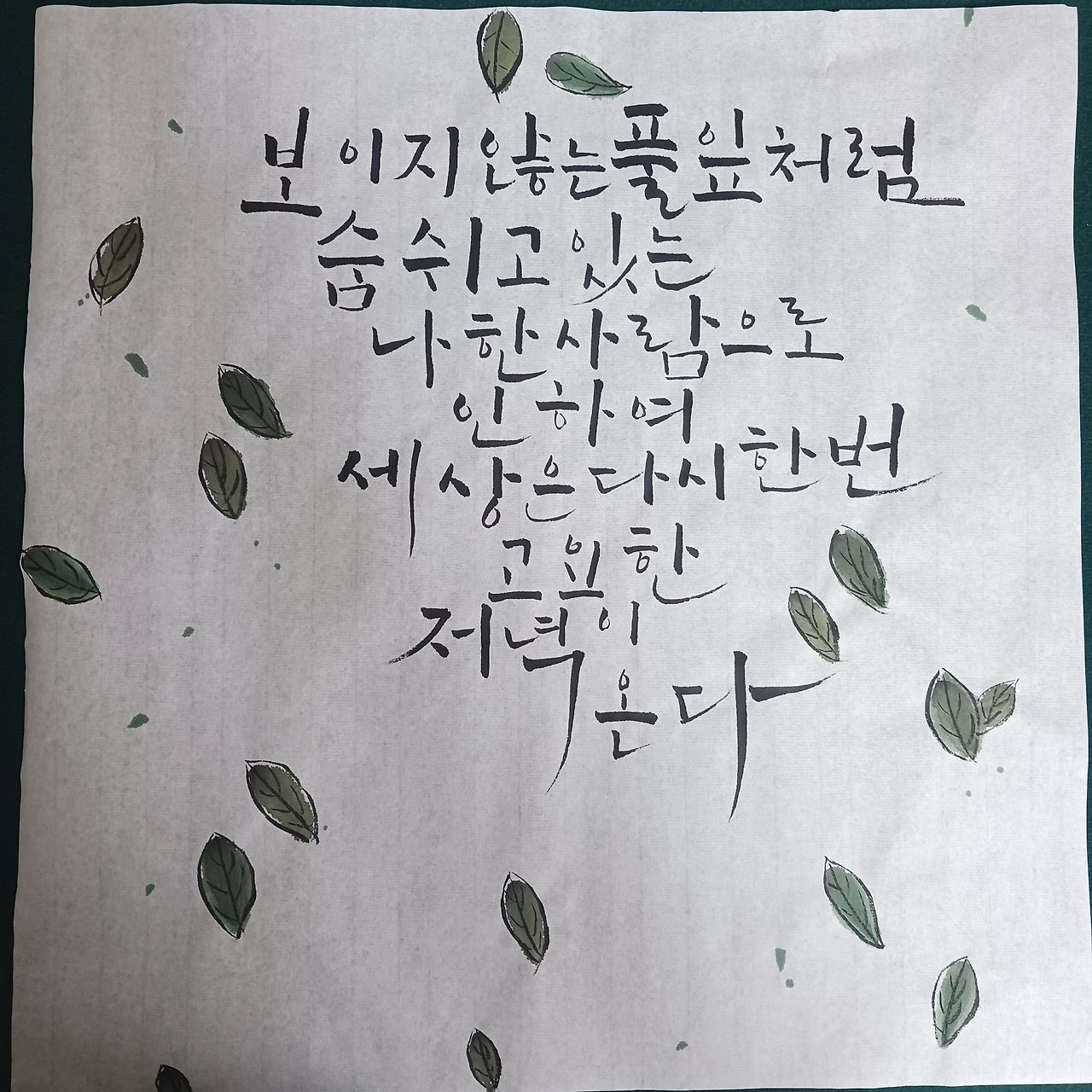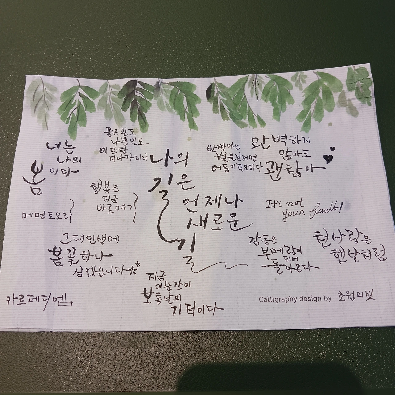 연습할 시간이 많이 없어 고민했던 캘리그래피. 일주일에 한 번이라도 늦게 가더라도 꾸준히 해보자는 마음으로 시작했는데 마음 수련에 아주 큰 도움이 되었습니다.