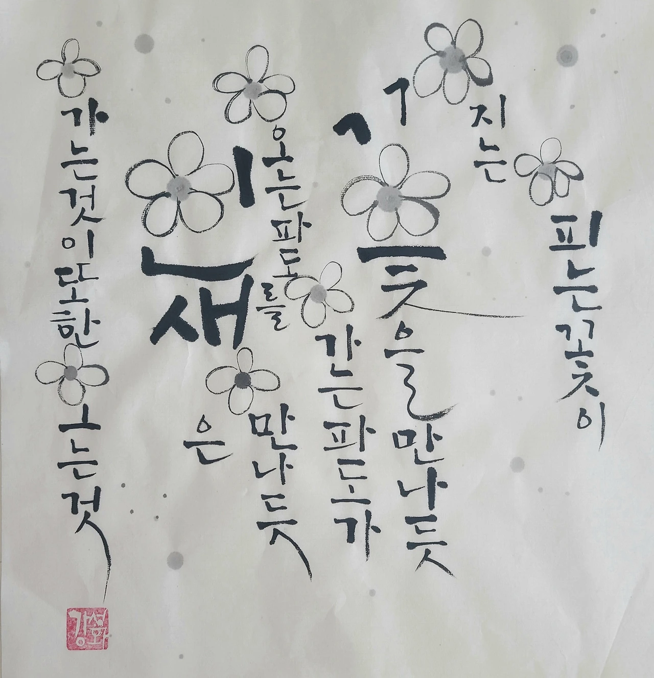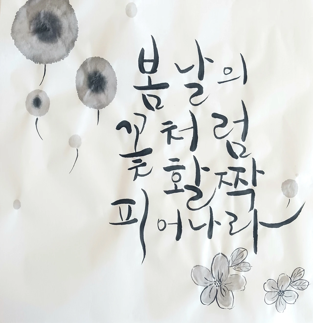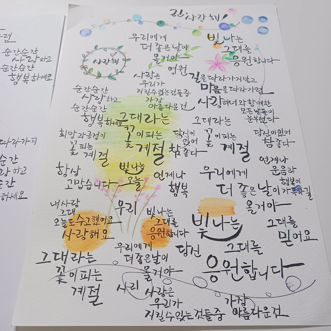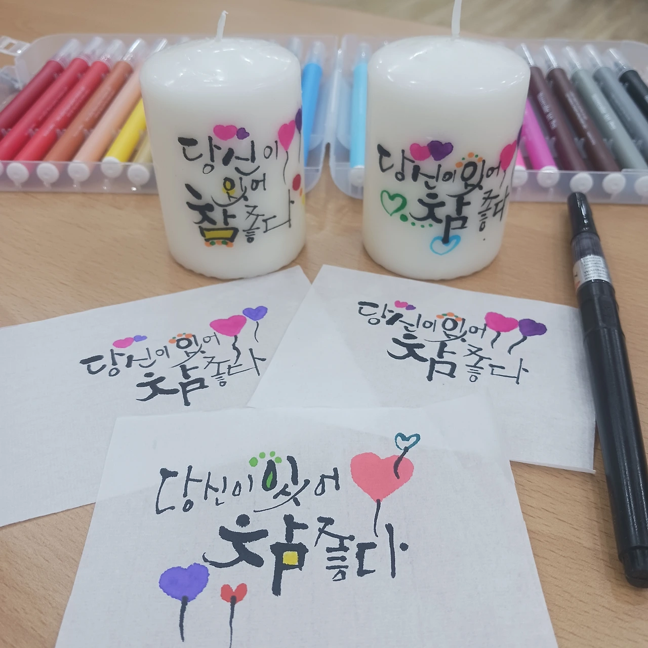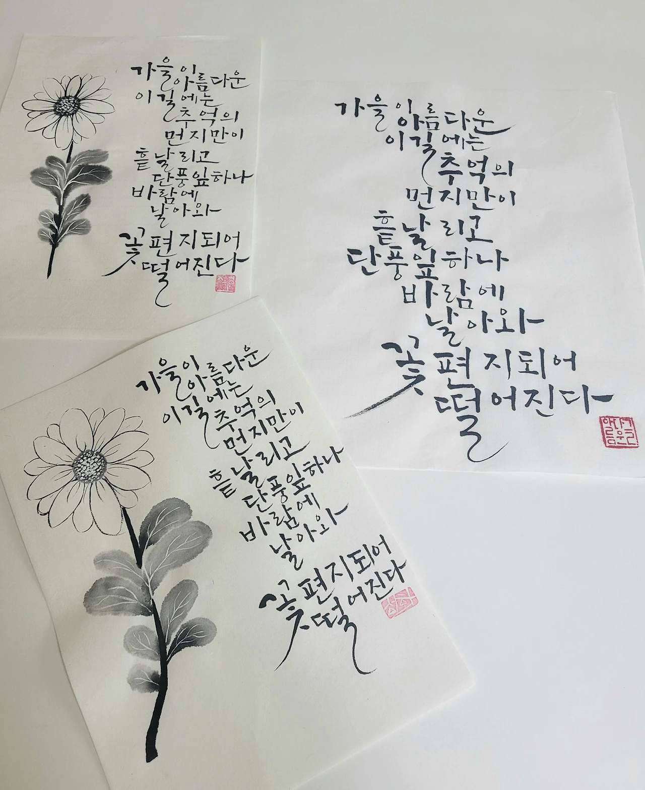 연습할 시간이 많이 없어 고민했던 캘리그래피. 일주일에 한 번이라도 늦게 가더라도 꾸준히 해보자는 마음으로 시작했는데 마음 수련에 아주 큰 도움이 되었습니다.