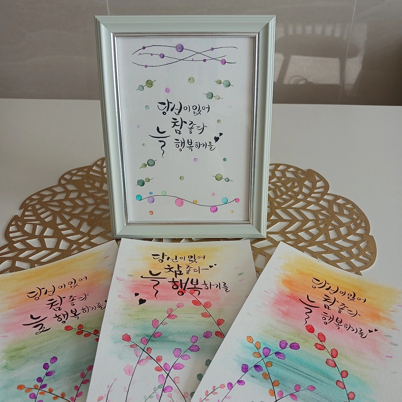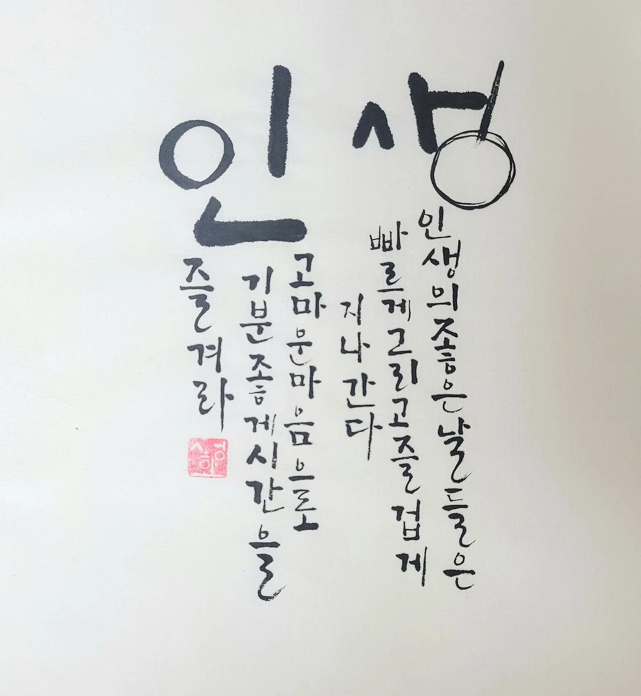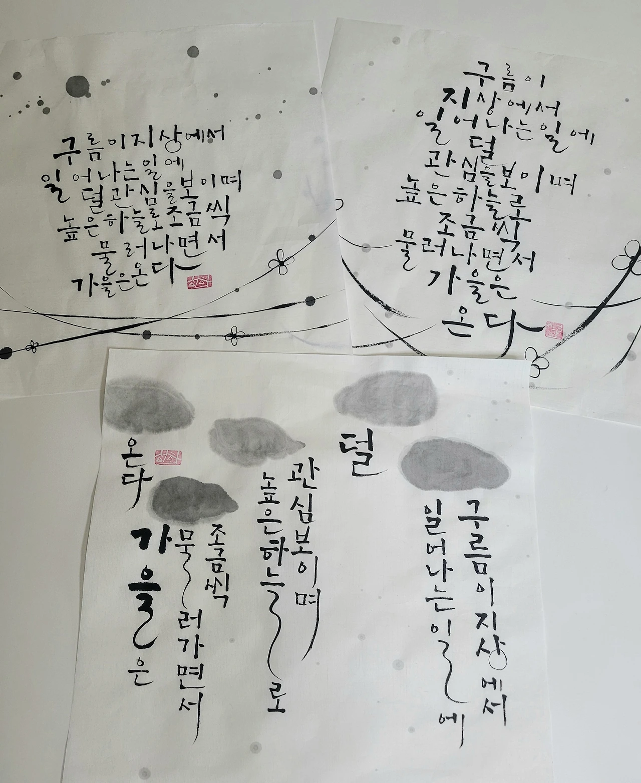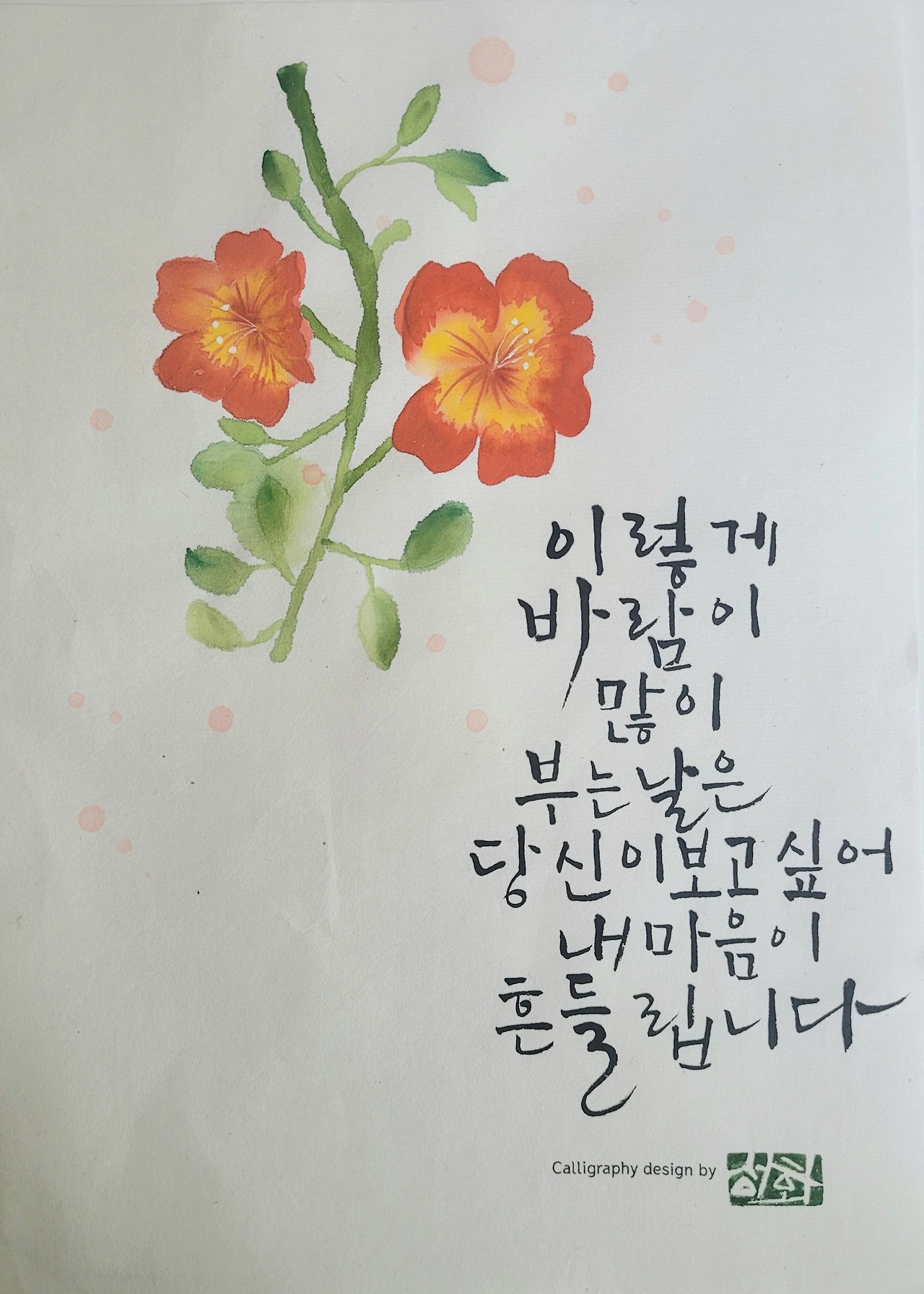 연습할 시간이 많이 없어 고민했던 캘리그래피. 일주일에 한 번이라도 늦게 가더라도 꾸준히 해보자는 마음으로 시작했는데 마음 수련에 아주 큰 도움이 되었습니다.