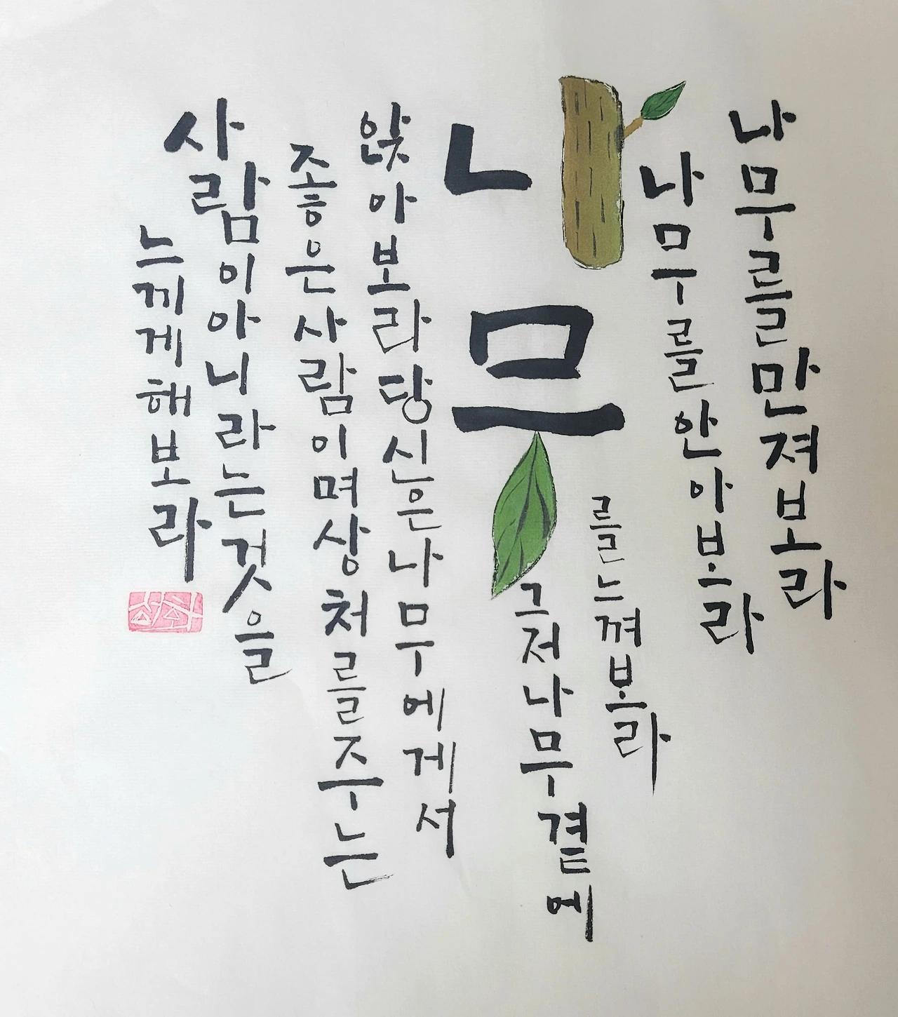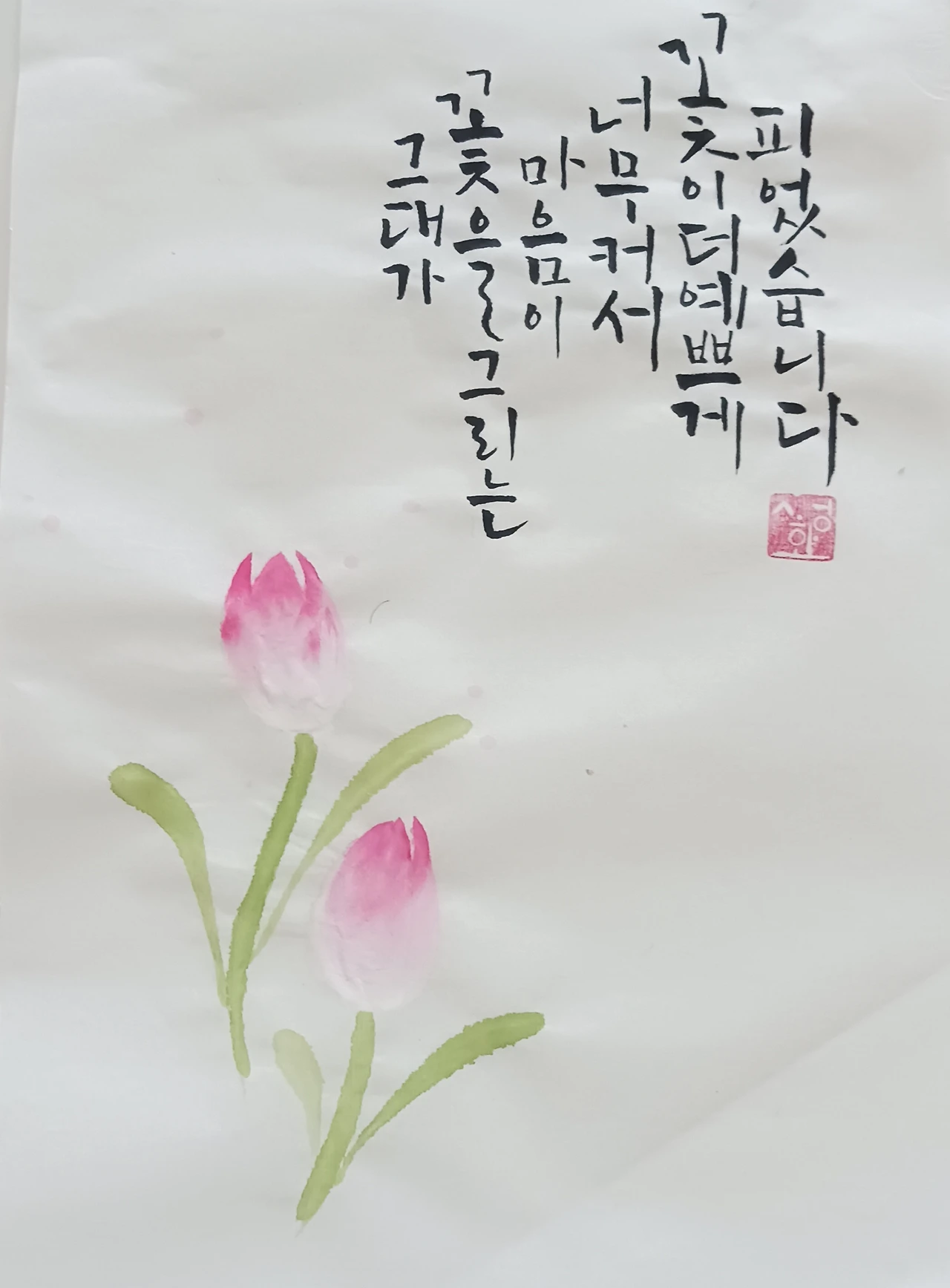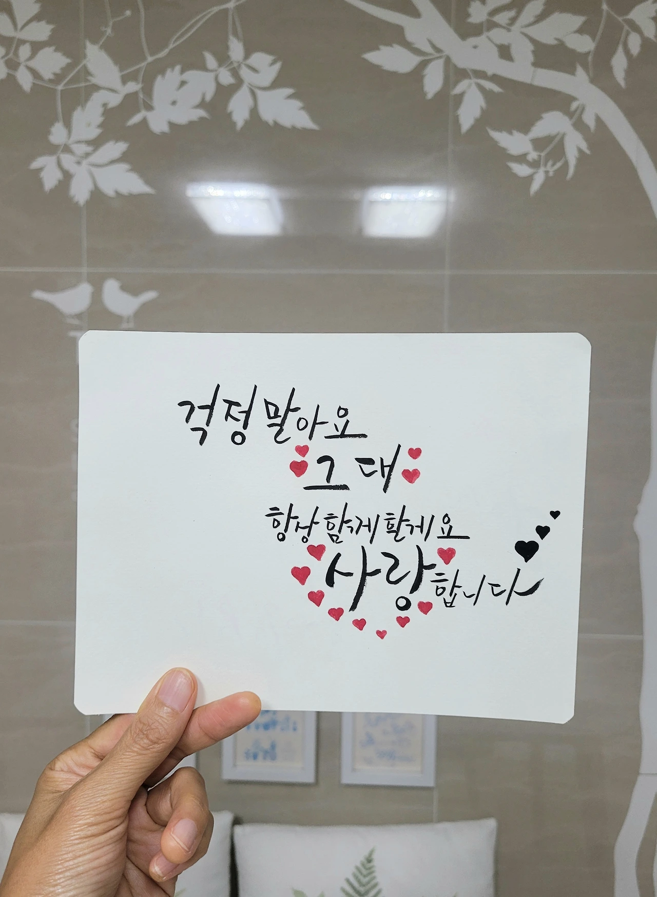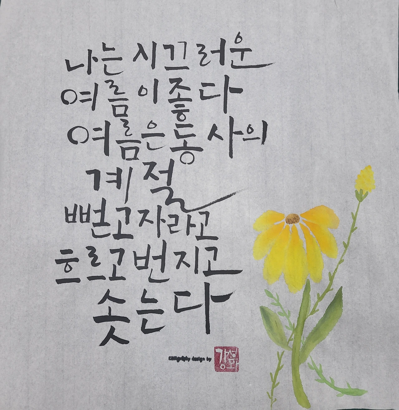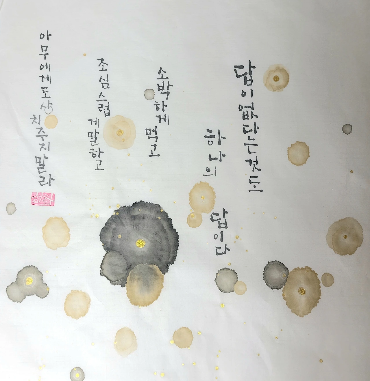 연습할 시간이 많이 없어 고민했던 캘리그래피. 일주일에 한 번이라도 늦게 가더라도 꾸준히 해보자는 마음으로 시작했는데 마음 수련에 아주 큰 도움이 되었습니다.