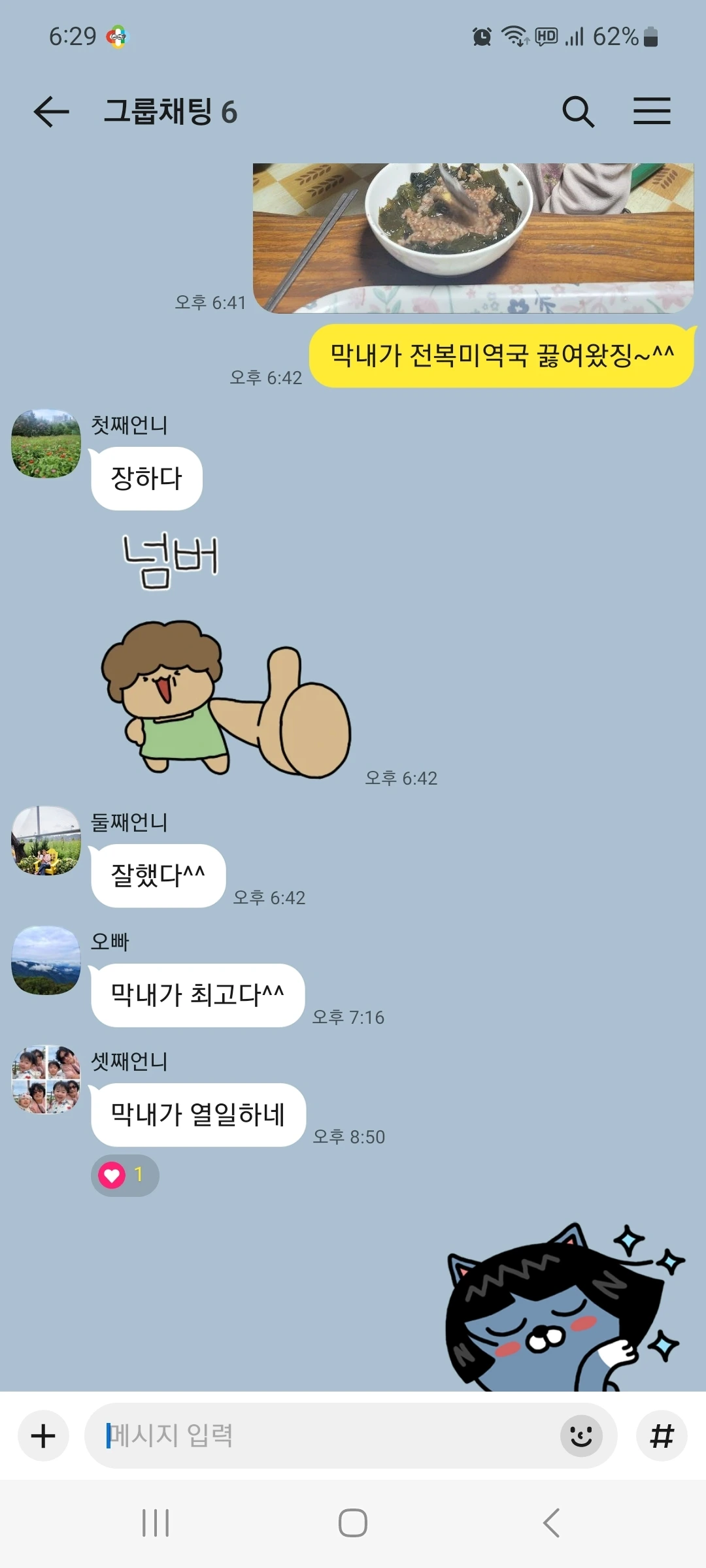 엄마 사진을 찍어 가족 단톡방에 올리니 이어지는 언니 오빠들의 폭풍 칭찬에 어깨가 으쓱해졌습니다.^^