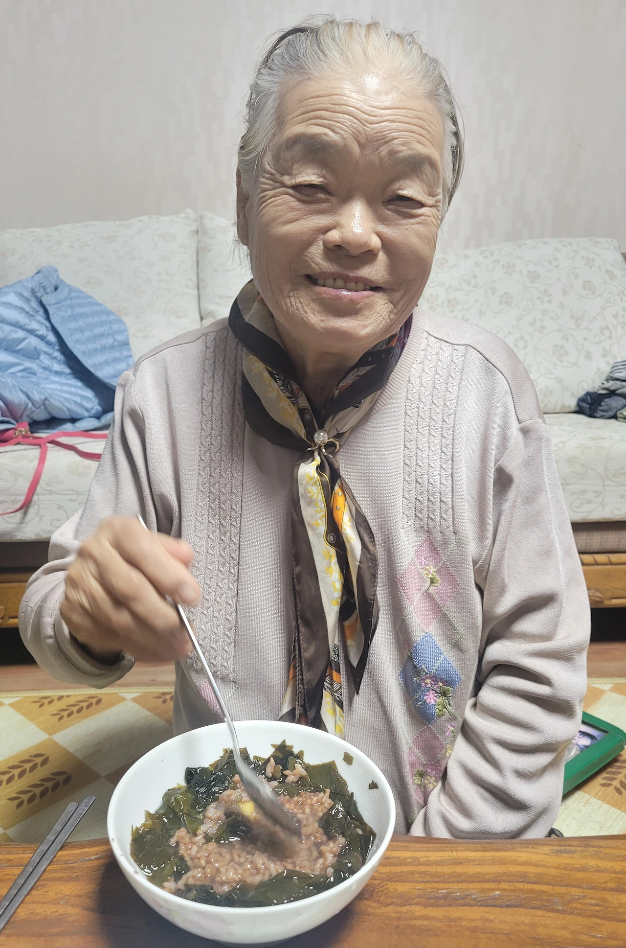 언니는 집으로 돌아가고 엄마와 단둘이 함께하는 저녁 시간. 엄마는 막내가 처음으로 끓여준 미역국을 맛본 후 맛있다 하시면서 밥 한 그릇을 말아드렸습니다. 환하게 웃으시는 모습을 보니 어찌나 좋던지. 미역국 그게 뭐라고 오래 미뤄둔 숙제를 마친 듯 마음이 가벼워졌습니다.
