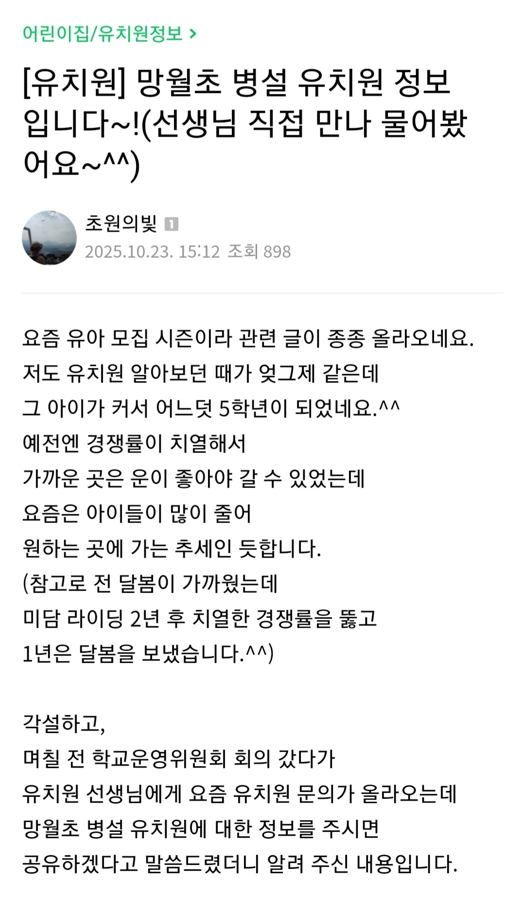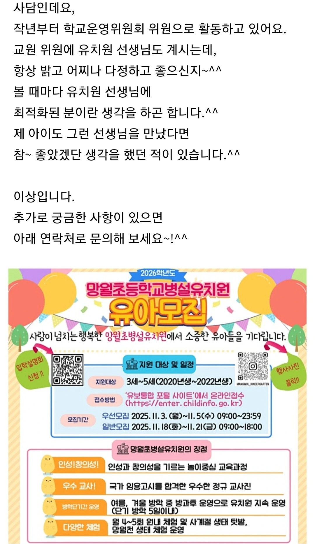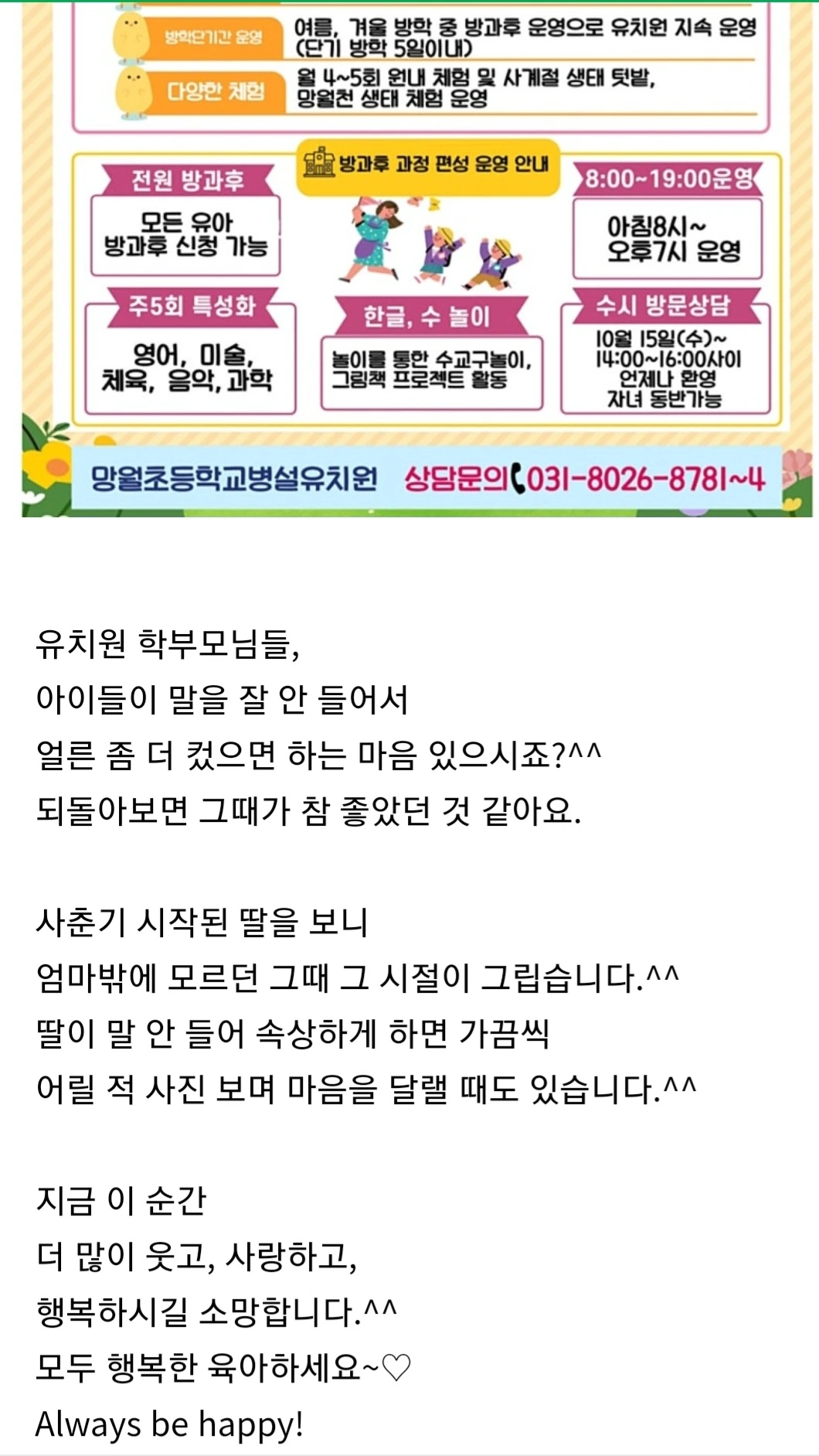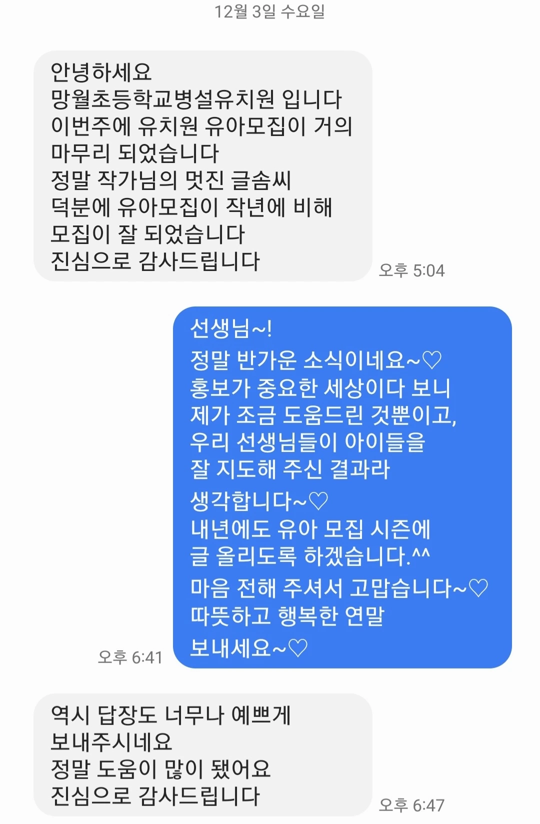 일전에 학교운영위원회 회의에서 전보다 유아 모집이 어렵다는 얘기를 들었습니다. 그냥 지나칠 수 없어 홍보 차원에서 지역 맘 카페와 우리 아파트 밴드에 글을 올렸는데 다행히 효과가 있었나 봅니다. 종일 기운이 없었는데, 그 문자 한 통이 영양 주사보다 효력이 좋았습니다.^^