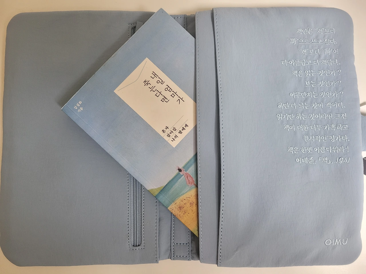 집에 돌아오자마자 준비해 주신 선물을 펼쳤는데, 세상에나.. 제 책표지와 비슷한 색상의 예쁜 책가방이었습니다. 이런 아이템이 있는지 처음 알았는데요. 선물을 준비한 분들의 마음이 느껴져 또 한 번 감동을 받았습니다.