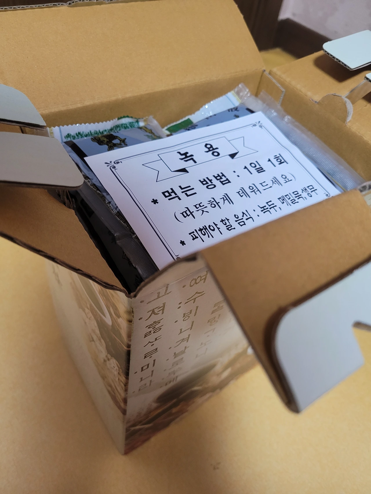 잠시 후 엄마는 보약 50포를 지어놓았다고 지금 하나 먹으라고 했습니다. 일전에 마을 사람들이 많이 먹는 곳이 있다며 한번 먹어보라 한 적이 있었는데, 괜찮다고 알아서 챙긴다고 했는데도 기어코...