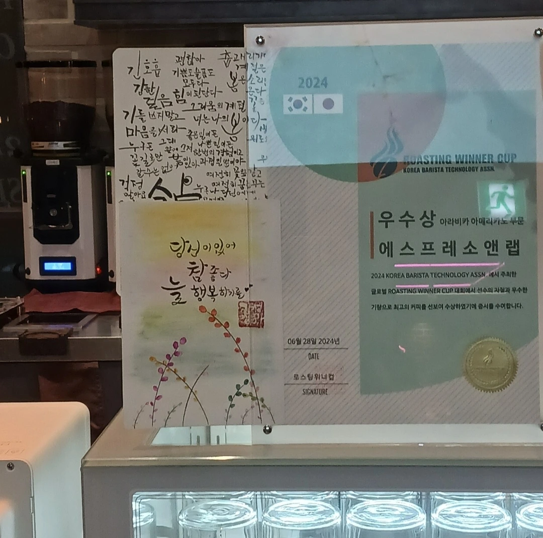 캘리 배우는 초기에 만든 걸 카페 지점장님에게 준 적도 있는데 그걸 또 잘 보이는 곳에 뒀더라고요.