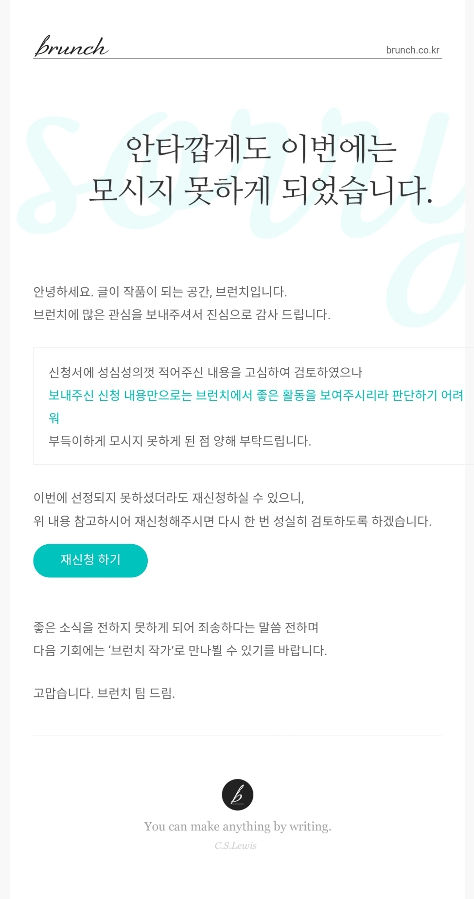 그렇게 두 번의 탈락 후 그제야 브런치 합격 후기를 찾아보게 되었고, 세 번의 탈락 후에야 겨우 브런치에 입성했습니다.^^