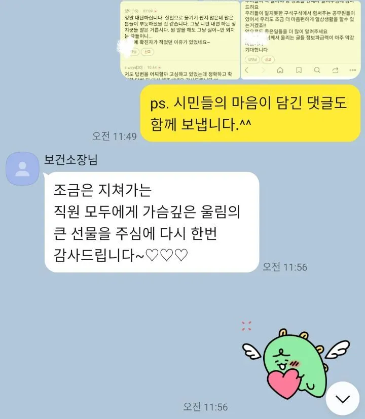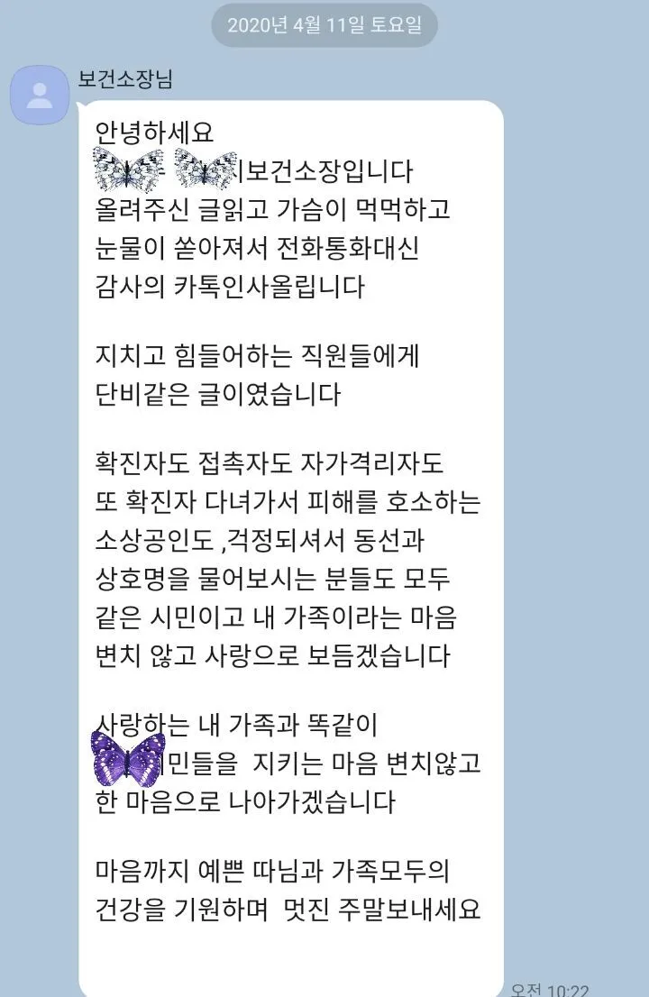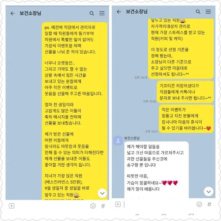 생일 선물을 의미 있게 쓰고자 코로나로 인연이 되었던 보건소장님에게 마음을 전해야겠다는 생각을 했던 것입니다. 그런데 전혀 생각지도 못했던 큰 선물을 돌려받고 감동을 받아 얼마나 많은 눈물을 흘렸는지 모릅니다. 그저 고생하시는 분들을 위해 제가 있는 자리에서 할 수 있는 일을 했던 것뿐이었는데..