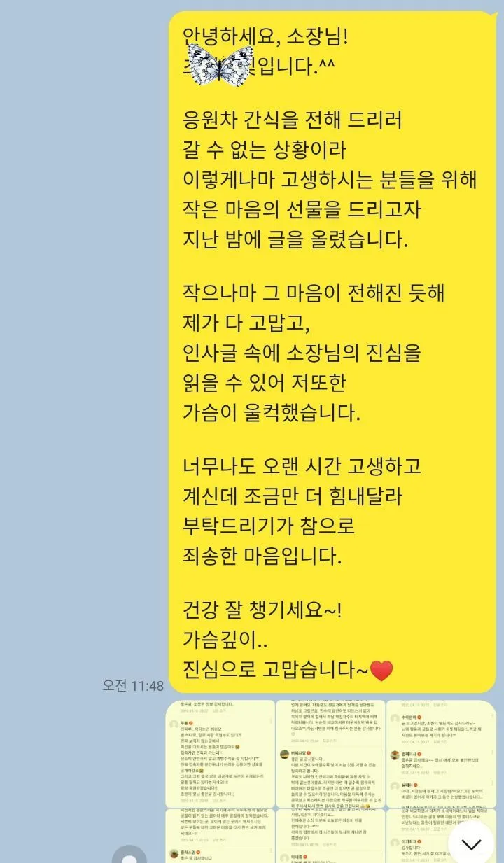 굳이 거창한 것이 아니라도 괜찮습니다. 고생하시는 분들을 위한 응원과 감사의 메시지가 담긴 것이라면 그 어떤 것이라도 상관없습니다.