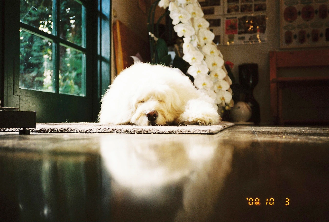 햇살 아래서 그저 낮잠 자고 있는 늙은 강아지를 보고 있다.