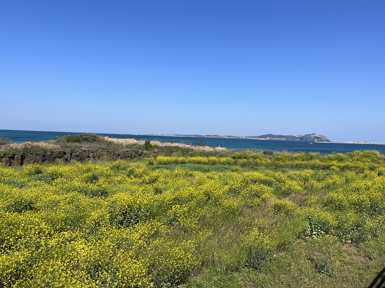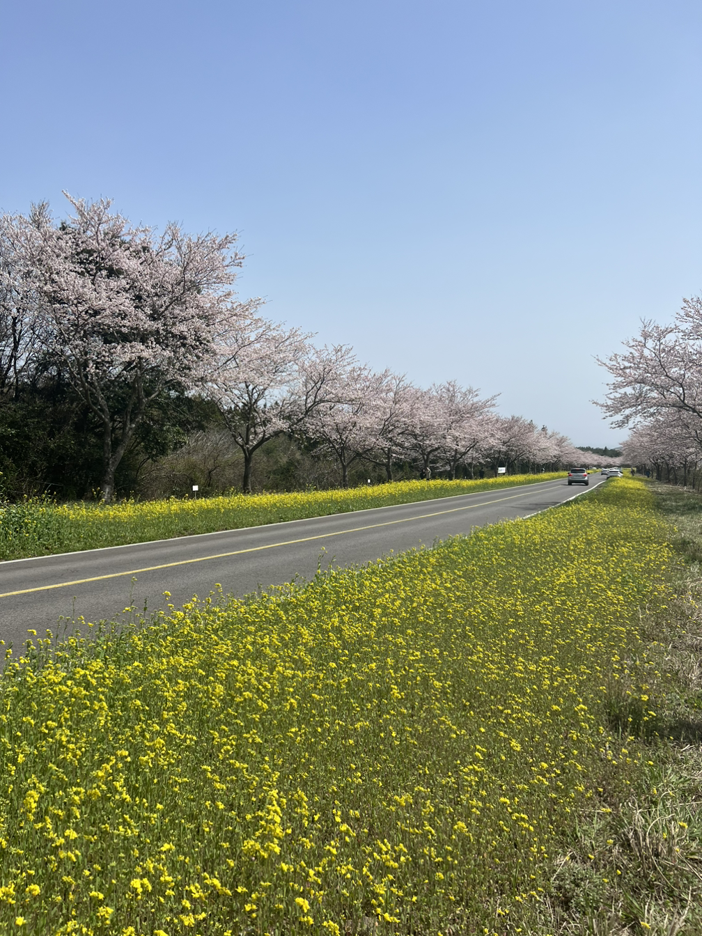 지인이 함께한 날에는 지인의 렌터카를 타고 가시리 벚꽃 유채길에 갔다. 유채는 키가 크고 벚꽃 나무는 흐드러져서 두 꽃이 만나는 것 같은 길이 10km가 이어진다고, 요가를 가르치러 오신 분의 추천을 따라간 것이다. 정말로 그 두 꽃이 만나는 장관은 아니었지만 하염없이 뻗어있는 꽃길이 예뻤다. 그 길의 끝에 3만 평의 유채밭이 있다는 정보도 들었지만, 결국 우리는 그곳을 찾다가 엉뚱한 공원으로 새서 3만 평의 유채꽃은 보지 못했다.