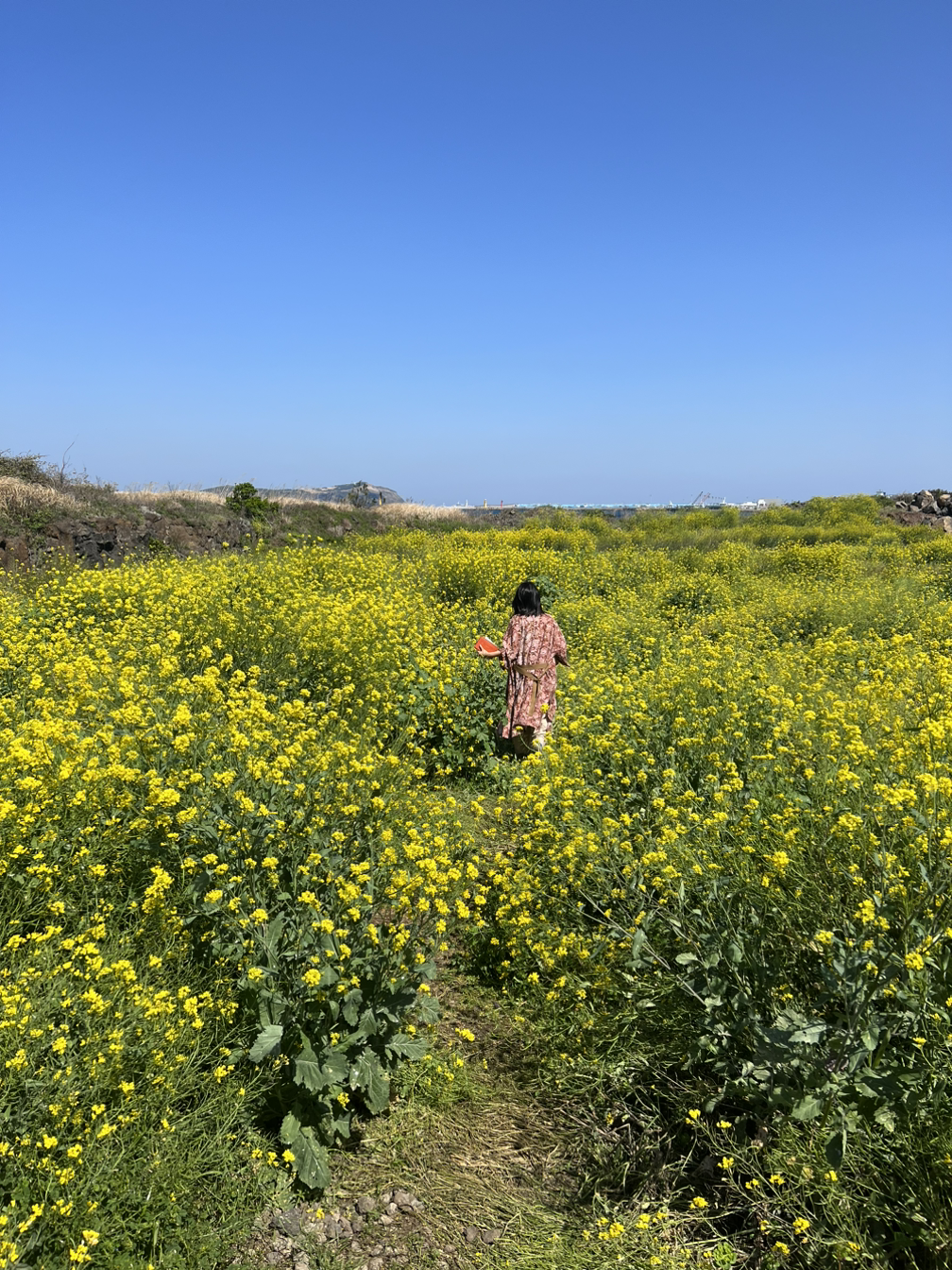 지인은 먼저 서울로 가고 나 혼자 남은 날. 3일째 보던 창밖에 노란 유채꽃이 눈에 들어왔다. 유채꽃이 있는 곳 직전까지 해변을 따라 산책을 했는데, 그 바로 옆 바위를 넘어서면 유채밭이 있었던 것. 나는 그 유채밭을 삼일째 되는 날 발견한 것이다. 3만 평은 아니었지만 바다를 배경으로 잔뜩 피어있는 유채꽃밭은 감탄을 자아내기엔 충분했다. 유채꽃 가운데에 서 있으면 유채꽃향이 코로 한가득 들어온다는 것을 처음 알았다. 어떤 꽃의 향은 화장품을 통해 익숙해지는데, 유채꽃의 향은 찝찌름한 바다 향을 미들노트로 그 위에 산뜻하게 얹히는구나.