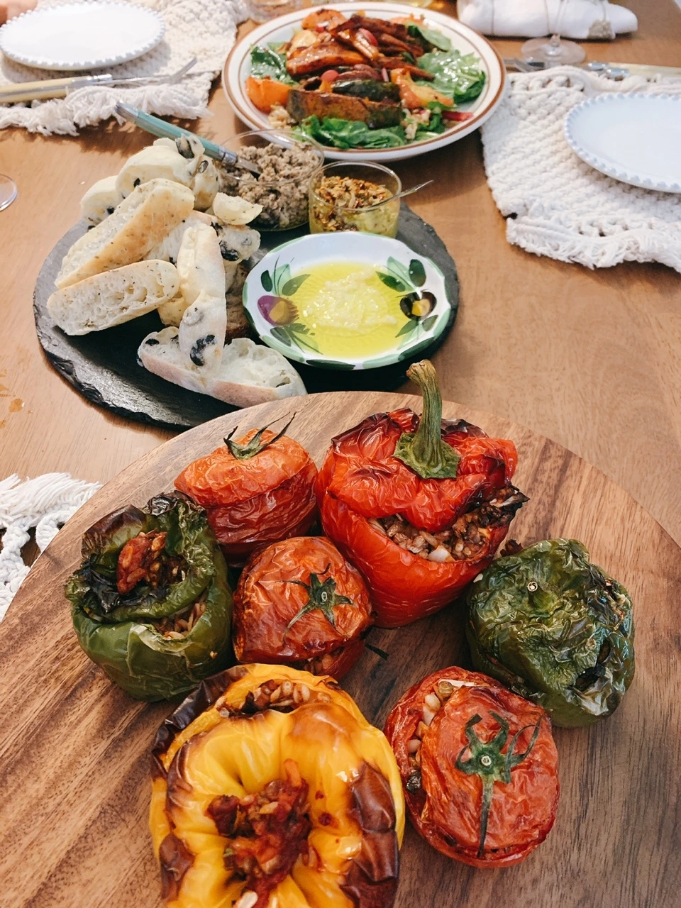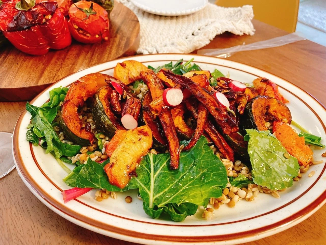 속을 채운 파프리카와 토마토 요리는 그리스 대표 요리 중 하나인 'Gemista'를 비건식으로 변형했다. 고기와 치즈를 빼고, 표고버섯과 렌틸콩, 아몬드가루를 더했다. 오레가노와 민트로 향을 올려 속을 만들고 속을 파낸 야채에 채워 구우면 채소만으로도 풍성한 맛이 올라온다. 흰쌀 대신 귀리와 율무로 속을 채워 건강에도 좋다. 예상 가능한 맛이지만, 중간중간 씹히는 표고버섯맛이 재미있기도 하고 가볍지만 풍성한 채소만의 감칠맛이 즐겁다. 곁들인 단호박 샐러드는 시나몬과 메이플 시럽에 단호박을 묻혀 구워 올리는 것이 핵심이다. Gemista를 만들고 남은 곡물과 콩을 함께 활용했고, 당근도 길게 썰어 단호박과 같은 소스에 묻혀 구웠다. 간단한 레몬 드레싱에 야채와 곡물, 콩을 버무려 깔고 위에 구운 단호박과 당근, 견과류를 얹어낸다. 큰 접시에 크게 담아내면 더욱 근사하다.