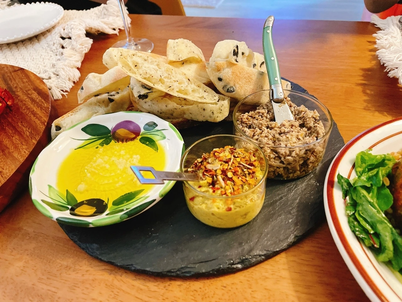 - 치아바타 2종과 2종의 딥 (애호박 잣소스, 비건버섯뒥셀)